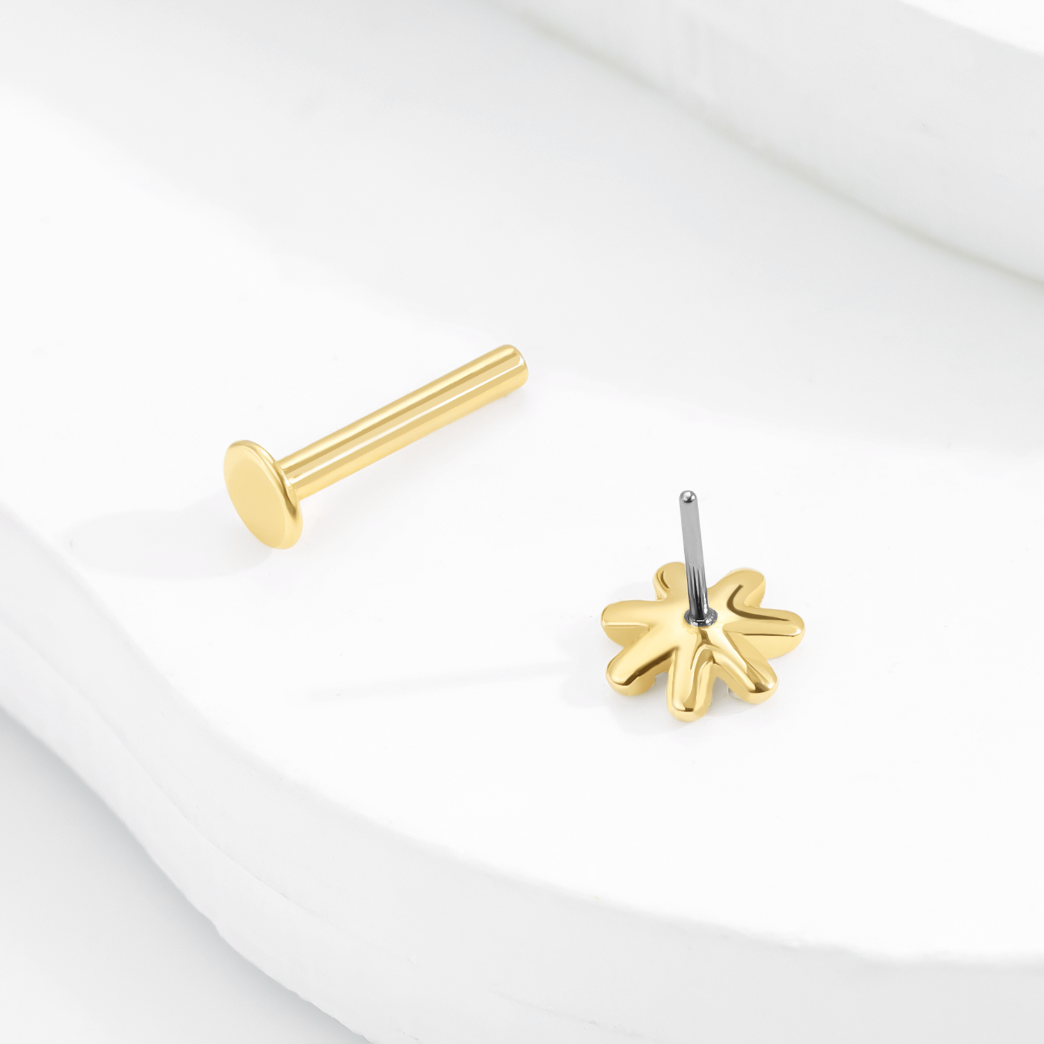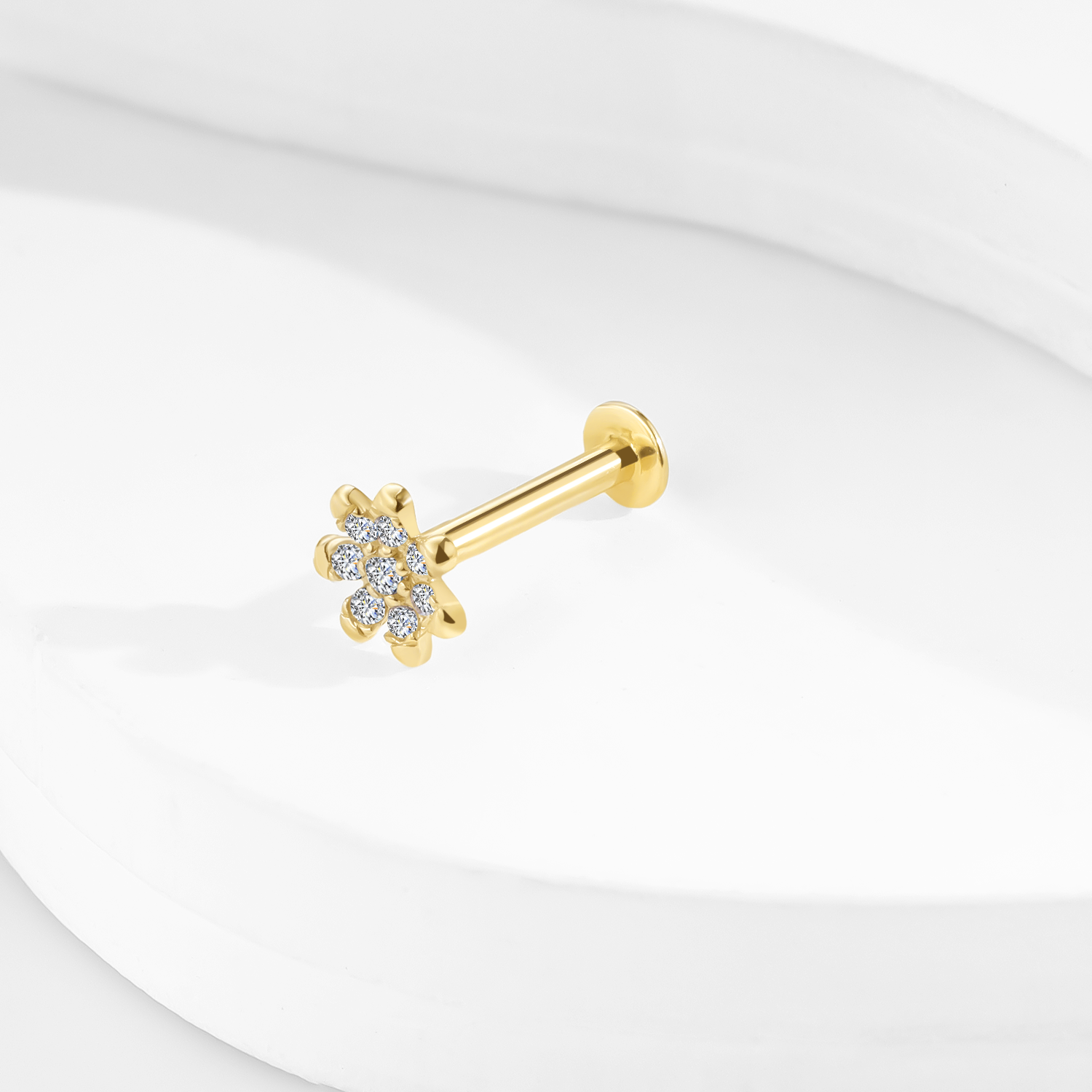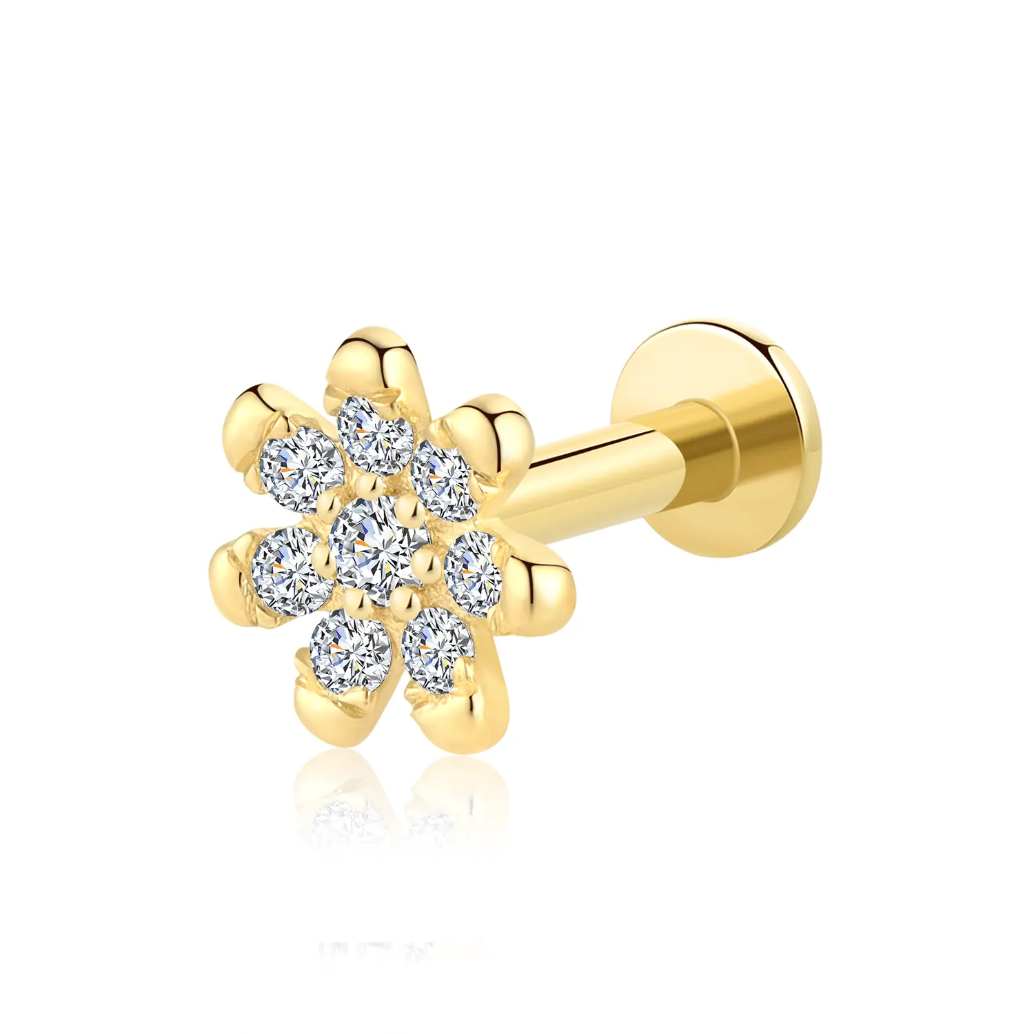 Introducing the GUB43267G, a beautiful 14K solid gold threadless labret stud featuring a dazzling flower design. Each petal is accented with brilliant round-cut CZ stones, creating a radiant floral centerpiece. Designed with a durable steel push-pin mechanism, this piece offers secure and comfortable wear, perfect for cartilage, tragus, or lip piercings.