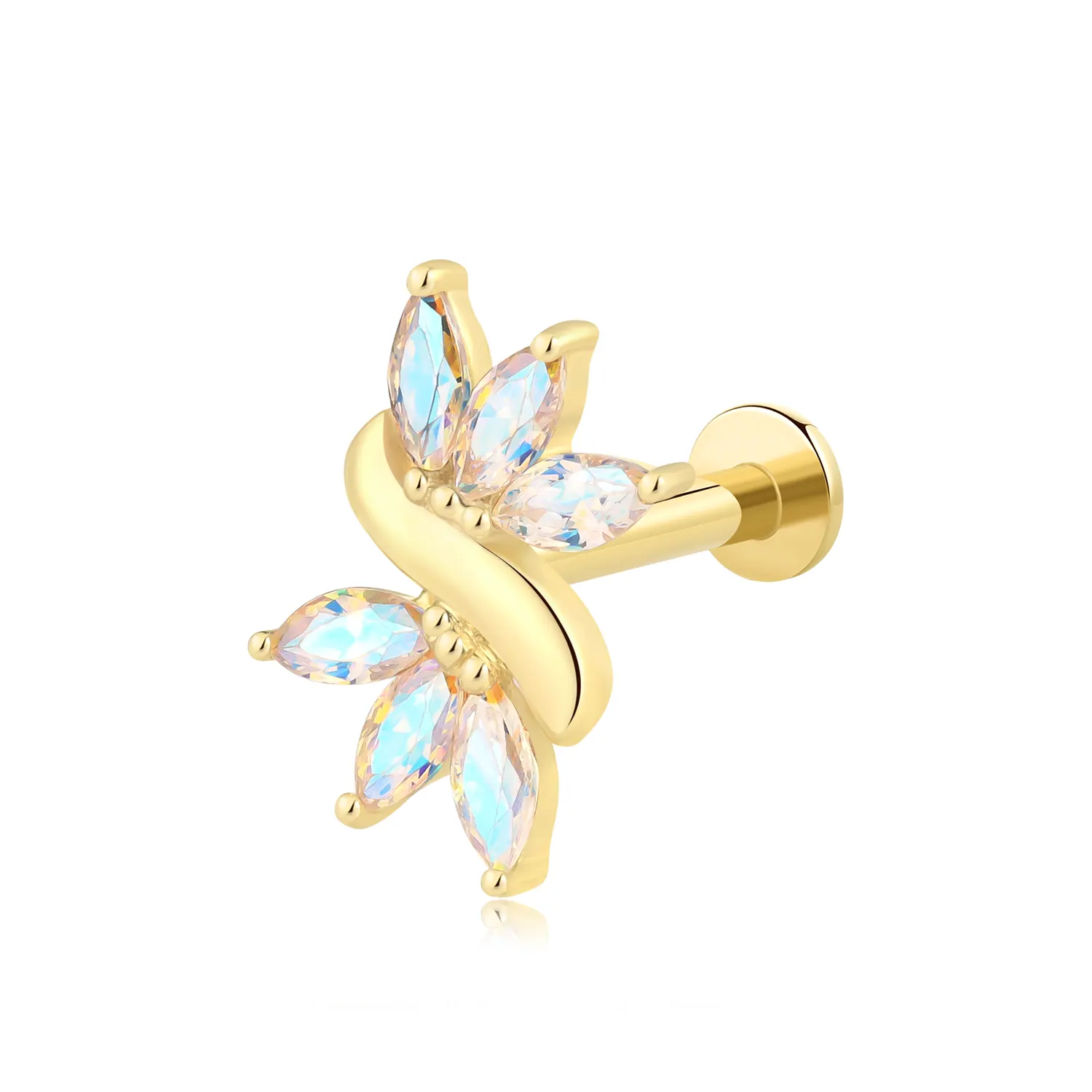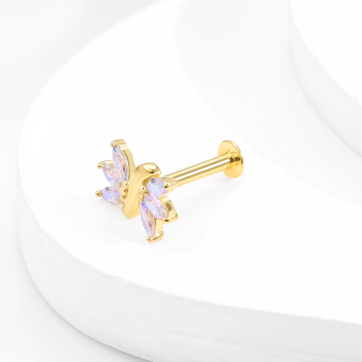 Introducing model GUE40392G, this 14K solid gold threadless labret stud features marquise-cut CZ stones arranged in a graceful butterfly design, delivering elegance and charm to any body piercing.