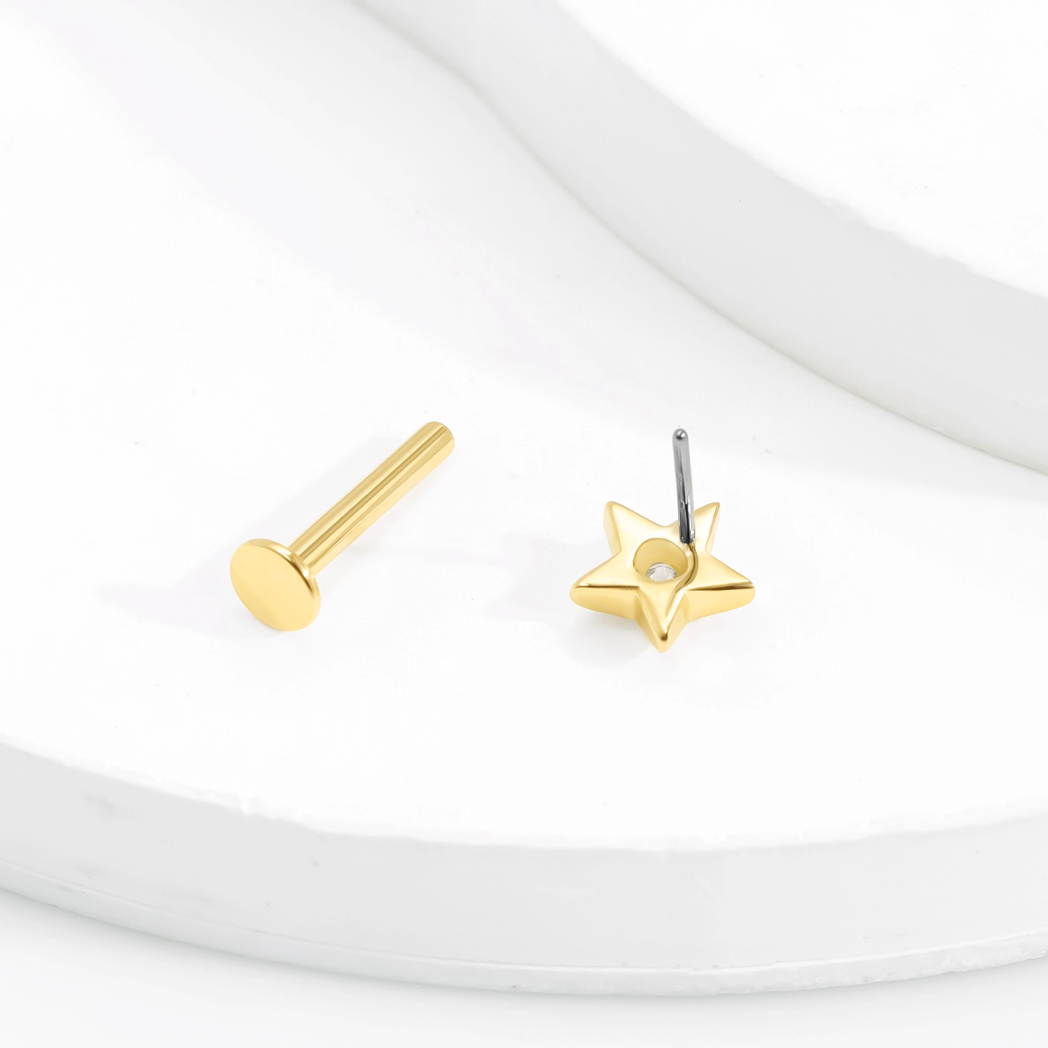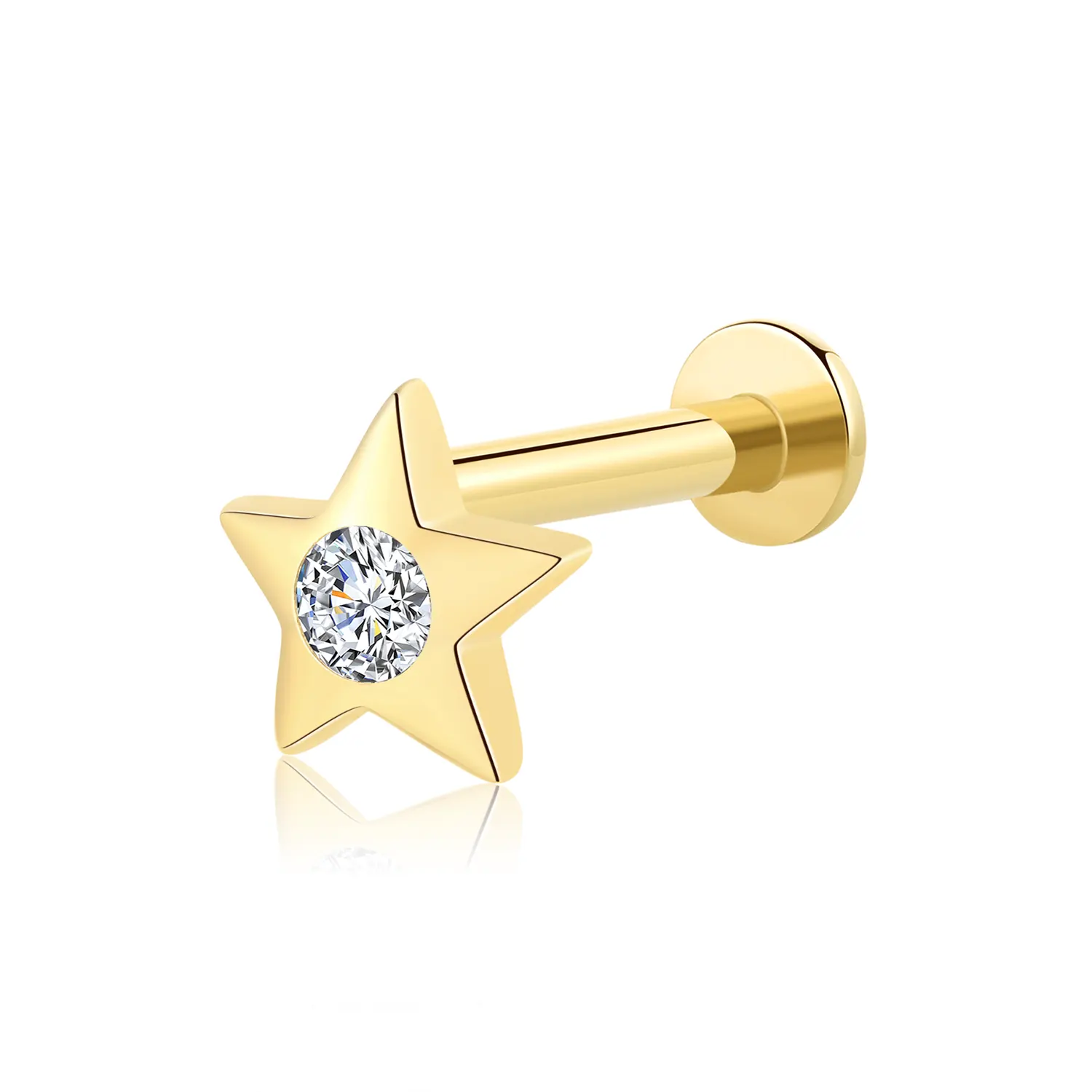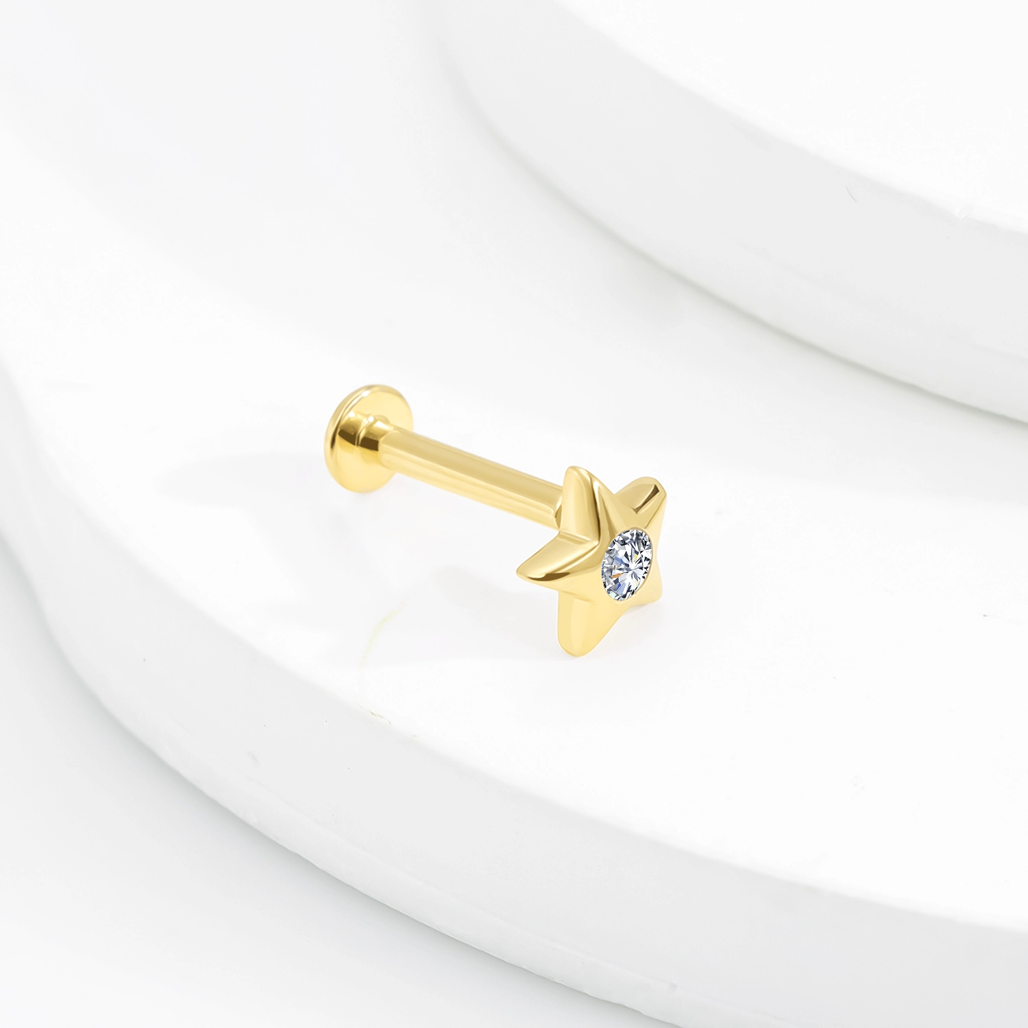 14K Solid Gold Threadless Labret Stud with CZ Stone – Classic Star Design