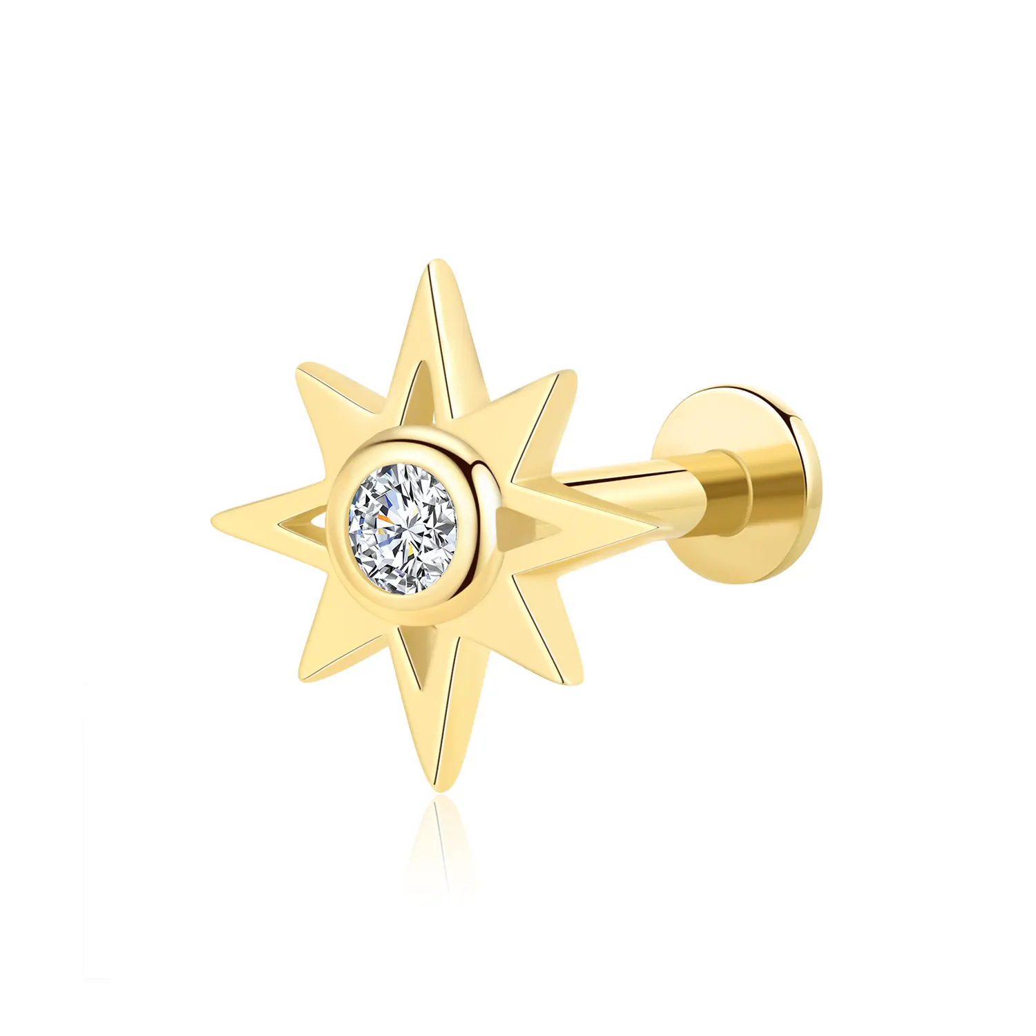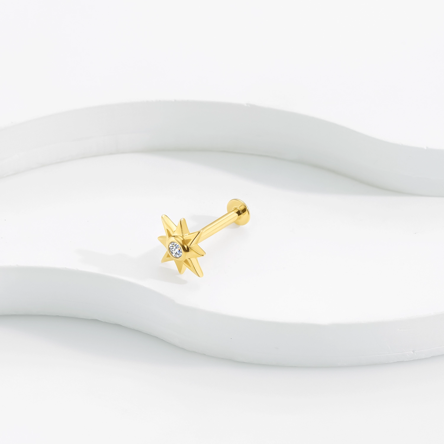Introducing GOH88G-16083, this 14K solid gold threadless labret stud features a striking starburst design with a brilliant round CZ stone at the center. The eight-pointed star shape captures the radiant energy of the sun, making it an eye-catching piece for any piercing. The steel push pin ensures secure and comfortable wear, making this celestial-inspired design both functional and beautiful.