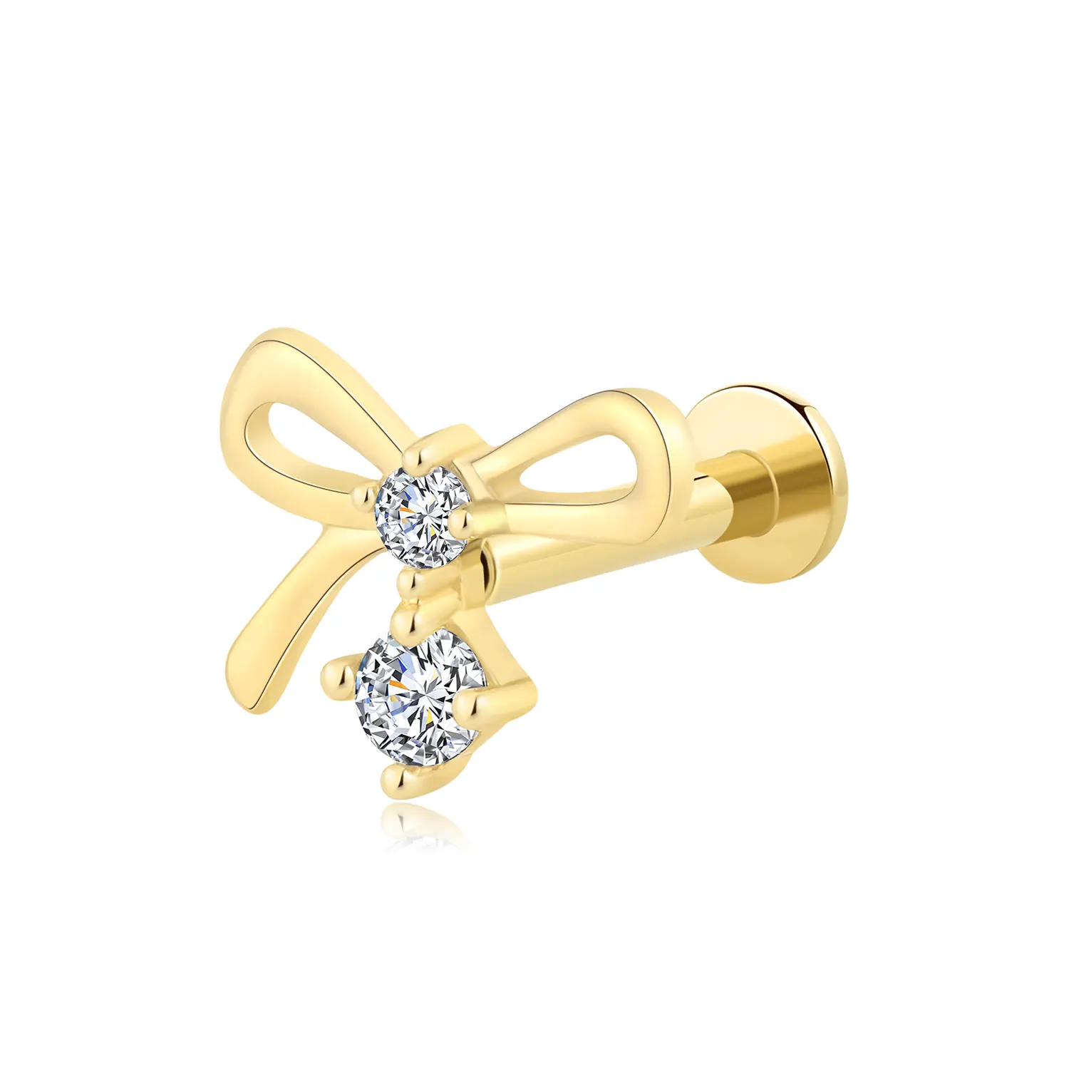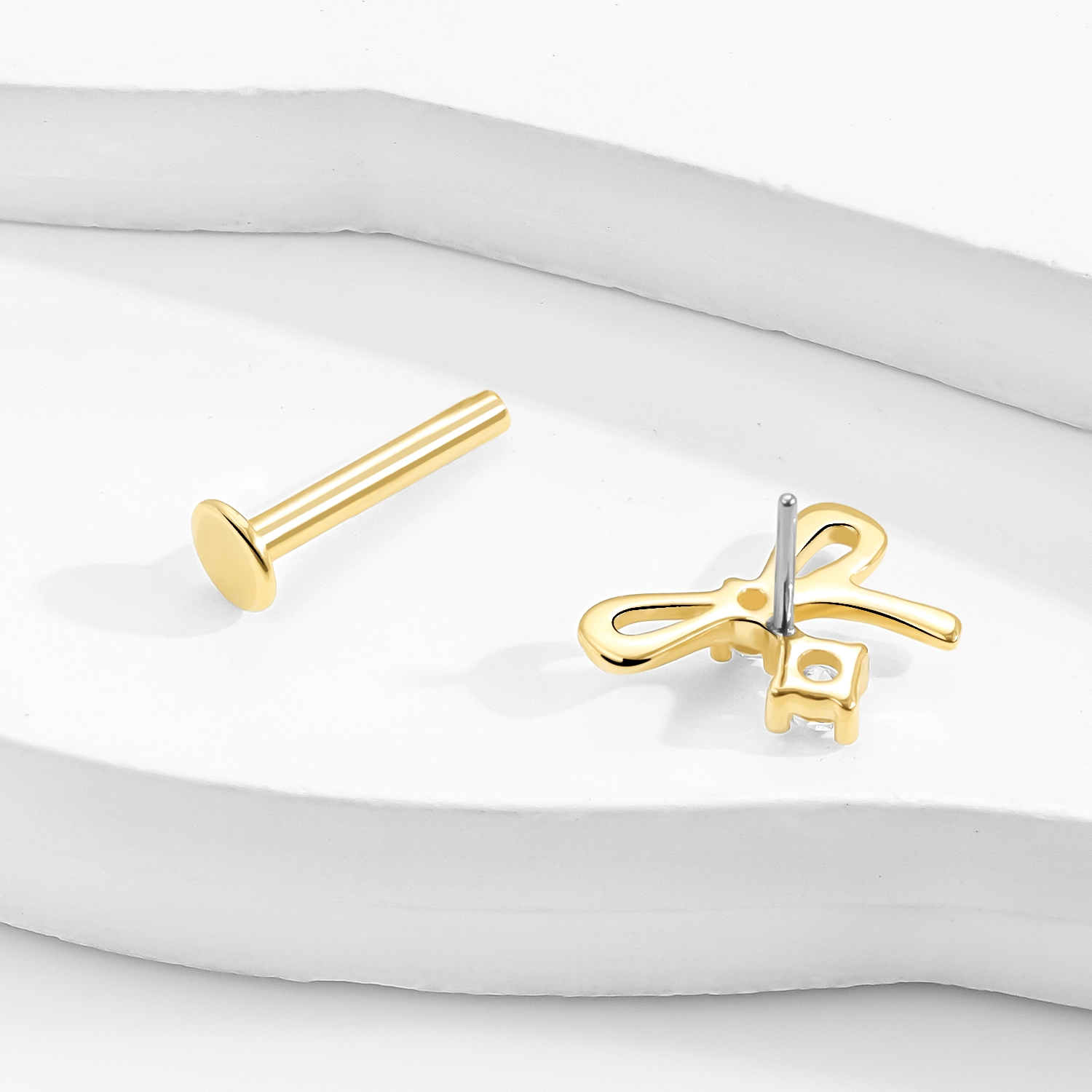 Introducing GUE40450G, a 14K solid gold threadless labret stud featuring a delicate bow design adorned with two brilliant CZ stones—an effortlessly charming piece for any piercing.