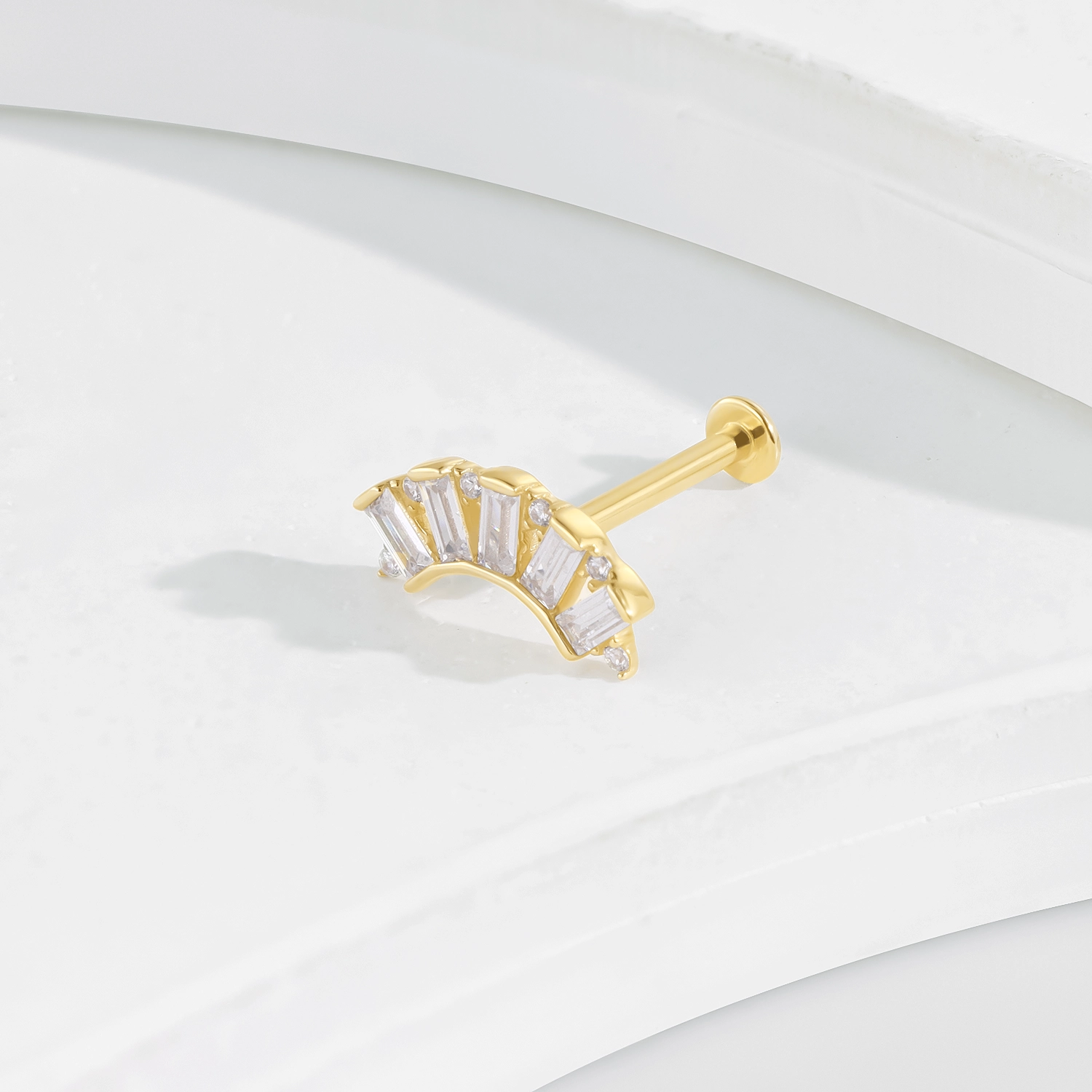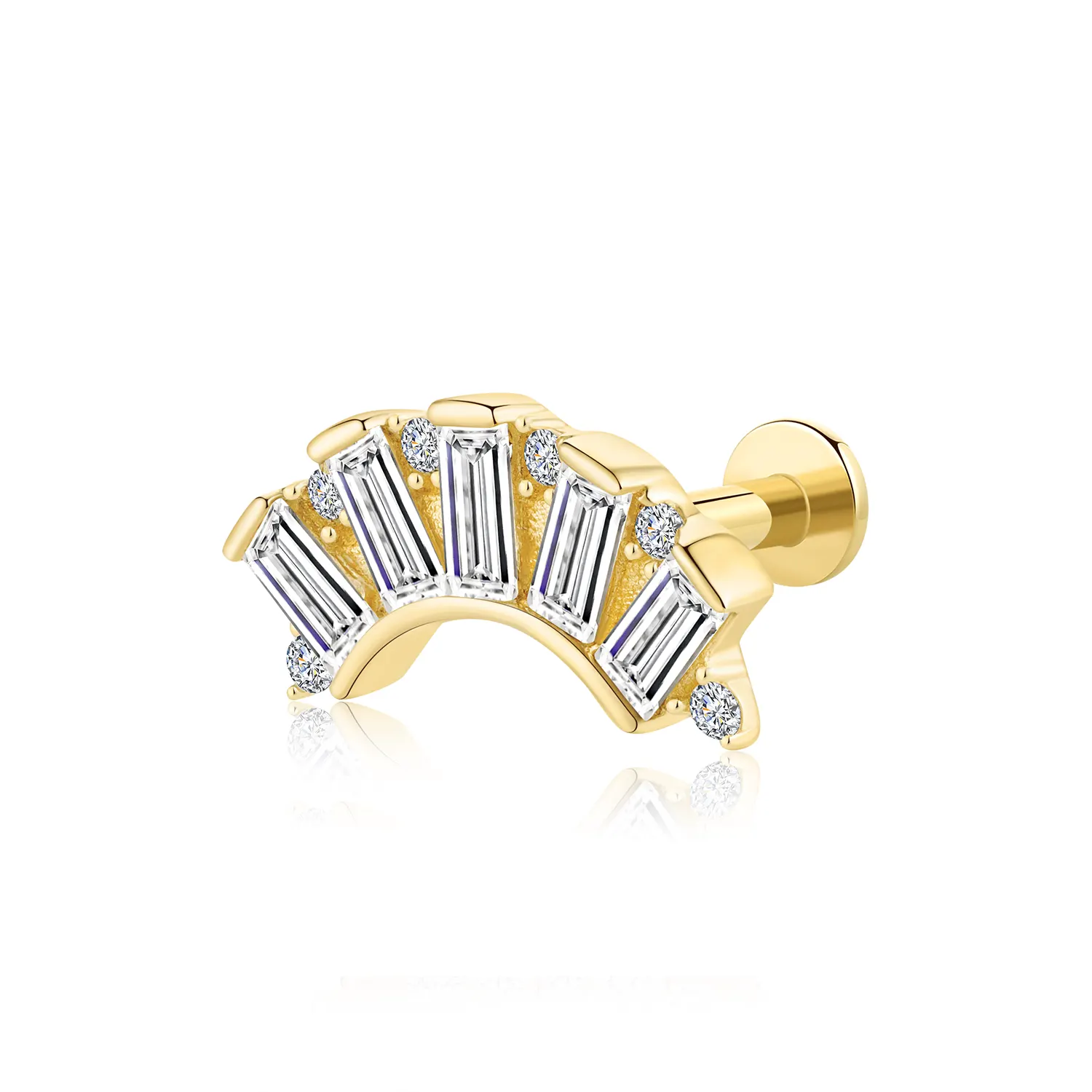 Introducing GUA37G: A 14K solid gold threadless labret stud featuring an elegant design with five rectangular CZ stones. This stylish and secure piece uses a steel push pin, making it a perfect addition for any body piercing enthusiast.