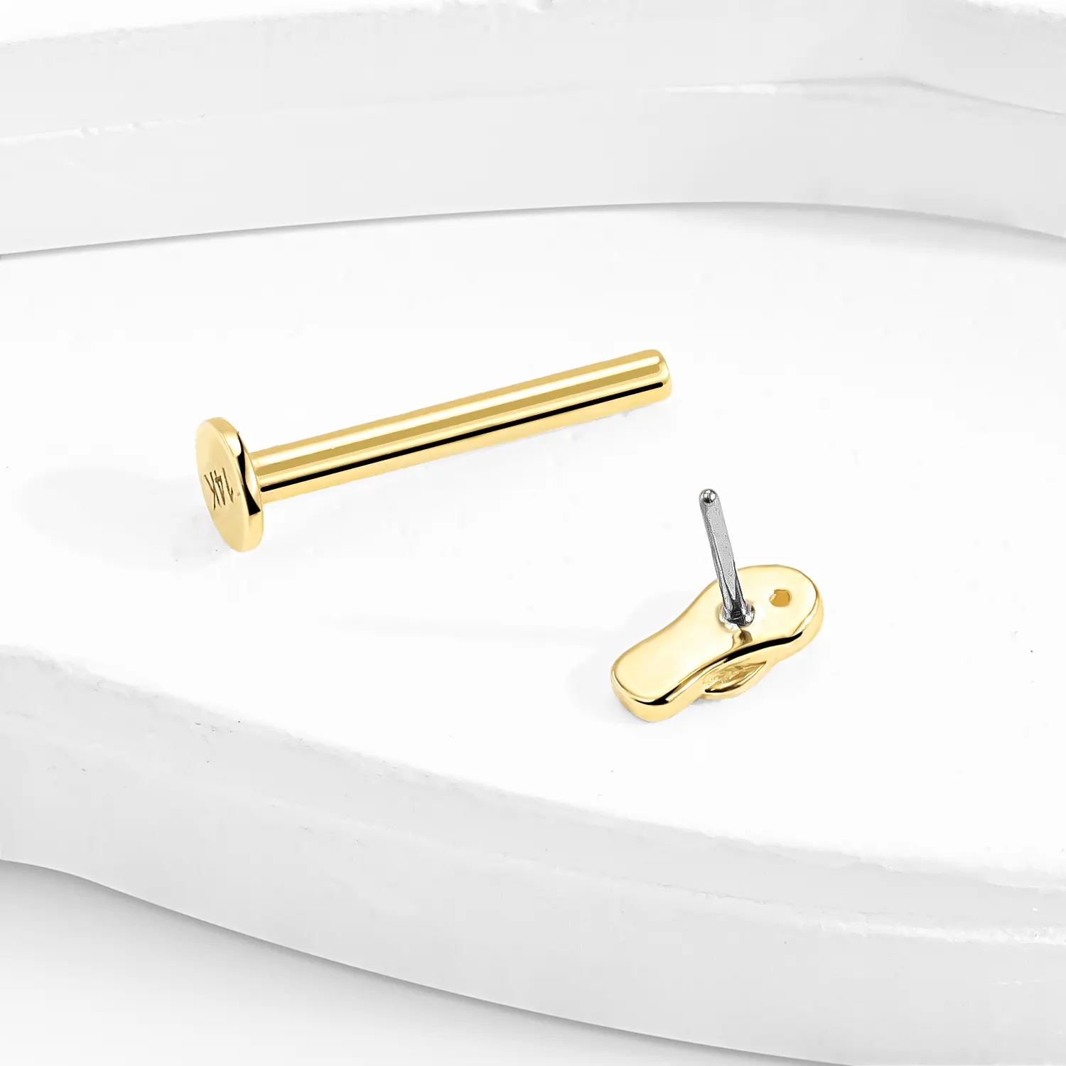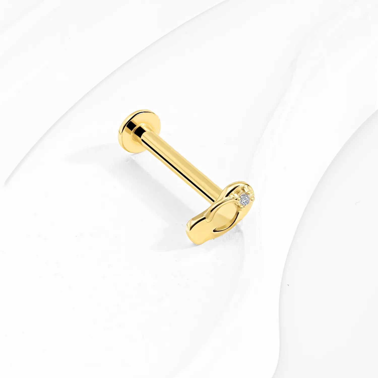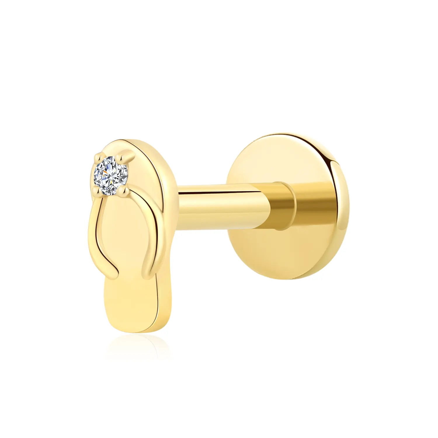 Introducing GUE31137G: A playful 14K solid gold threadless labret stud in the shape of a flip-flop sandal, finished with a sparkling CZ accent. A sunny, fun-loving twist on body piercing jewelry essentials.