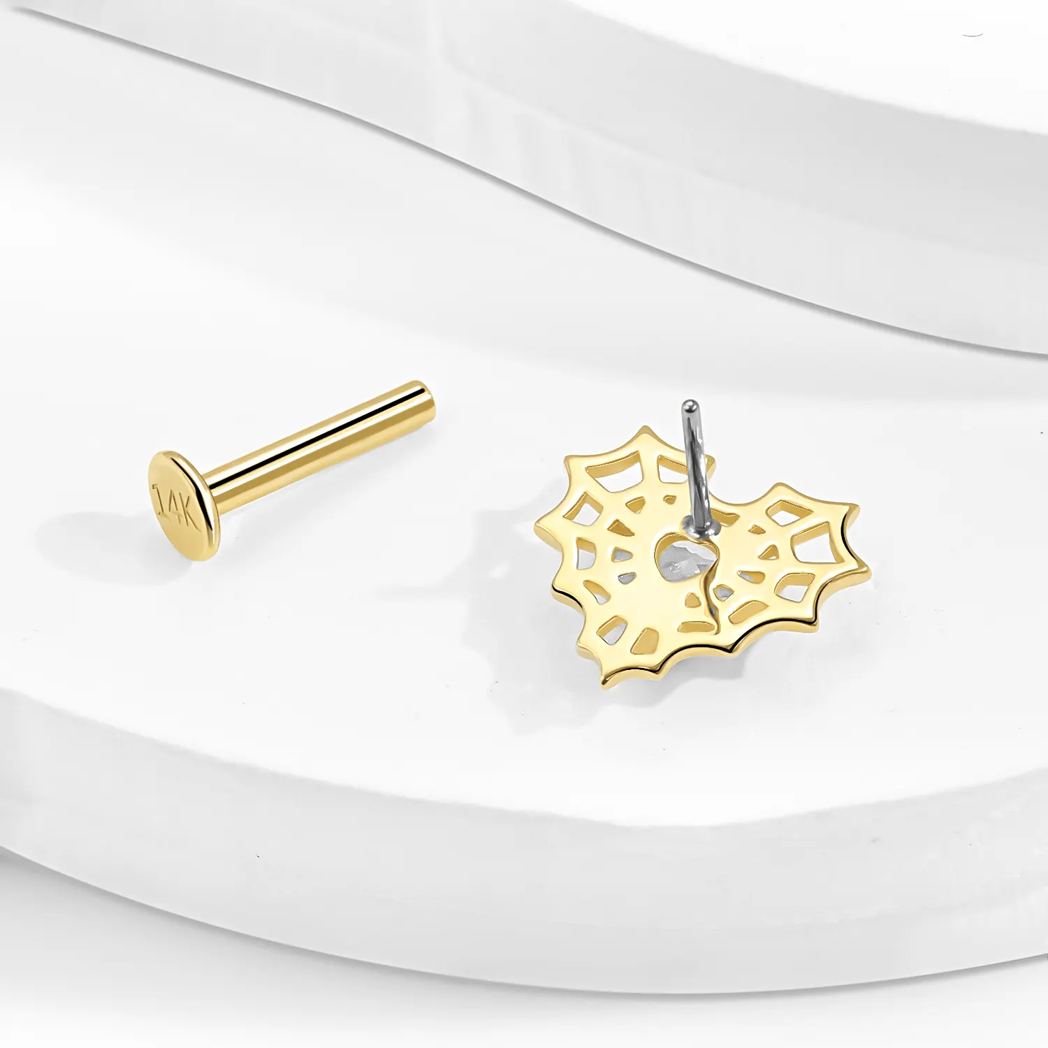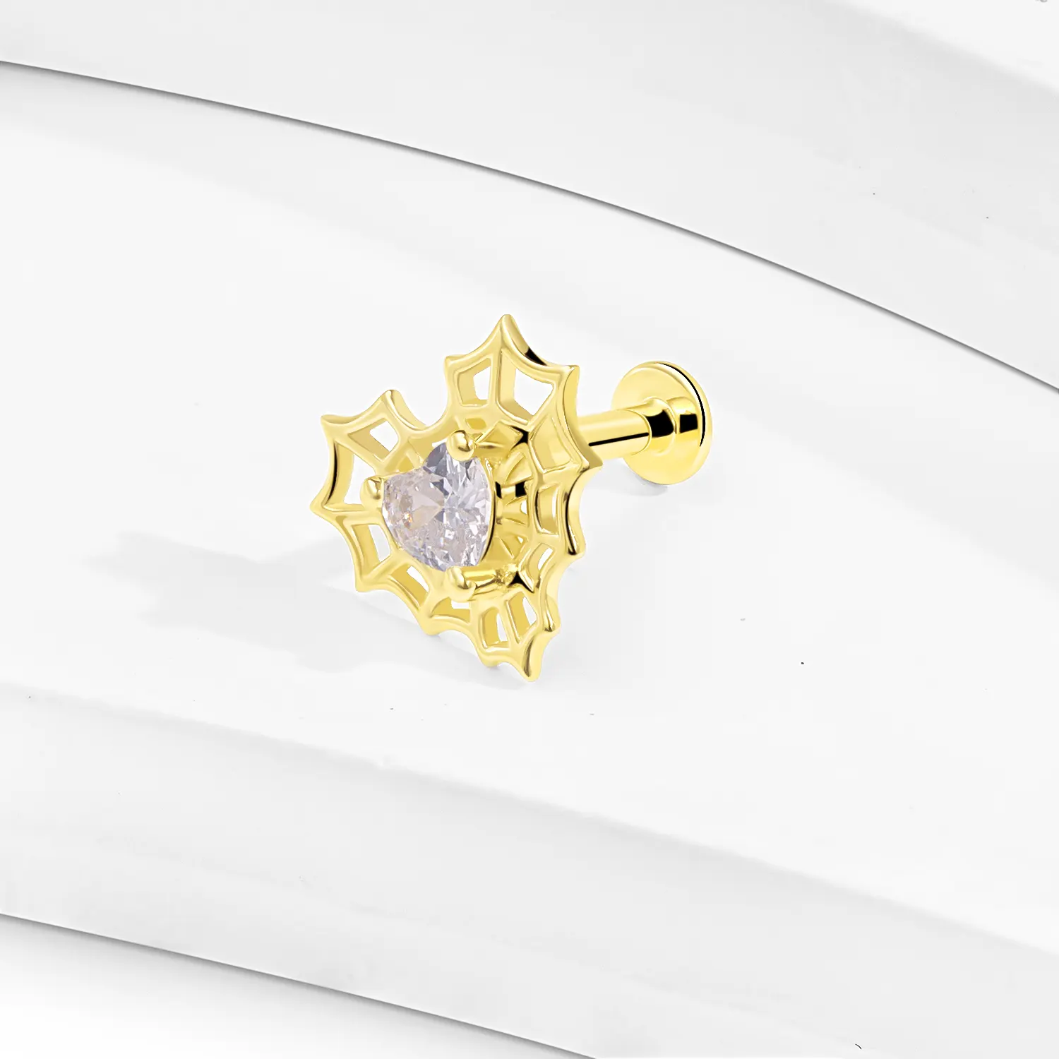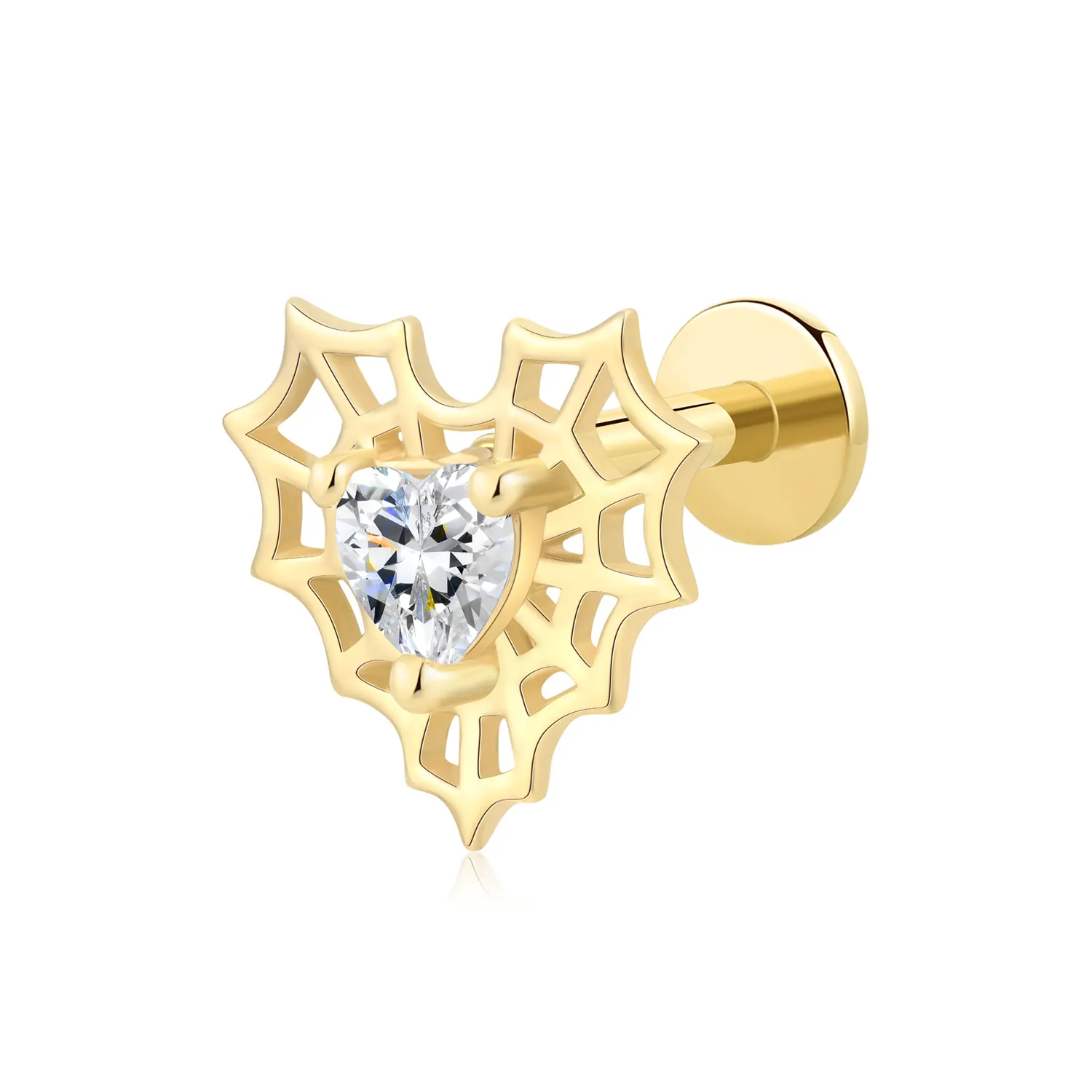 Introducing GUE31199G: this threadless labret stud features a 14K solid gold spider web frame embracing a dazzling heart-cut CZ. A bold fusion of edge and elegance for standout piercing style.