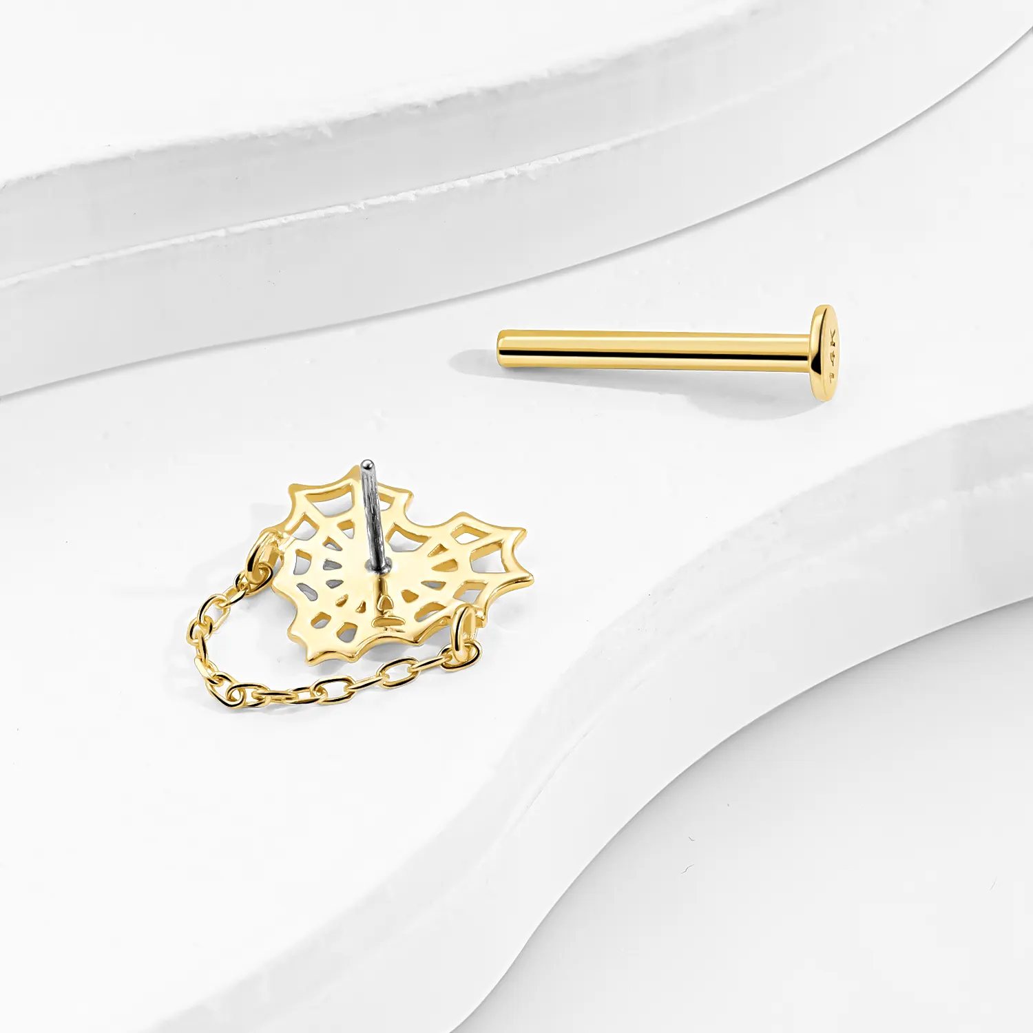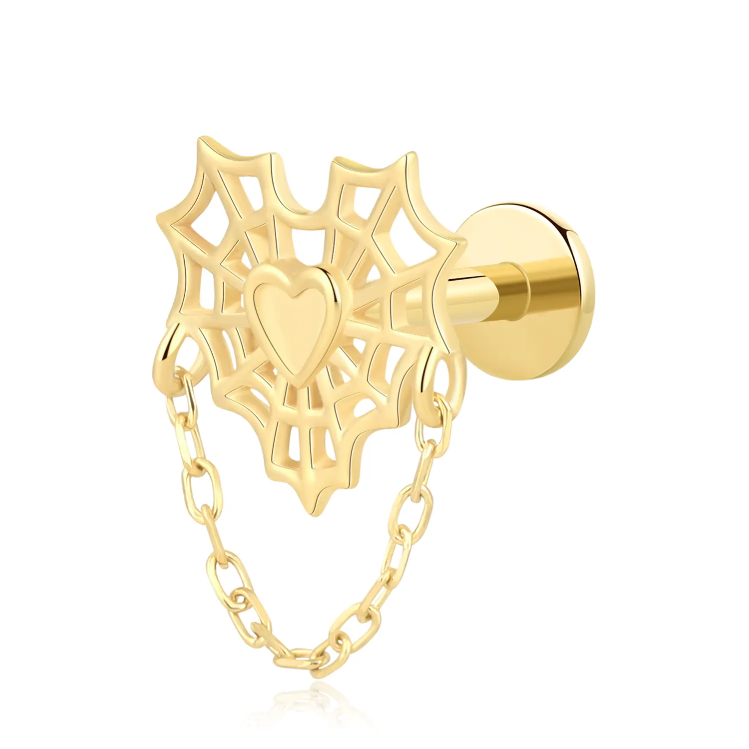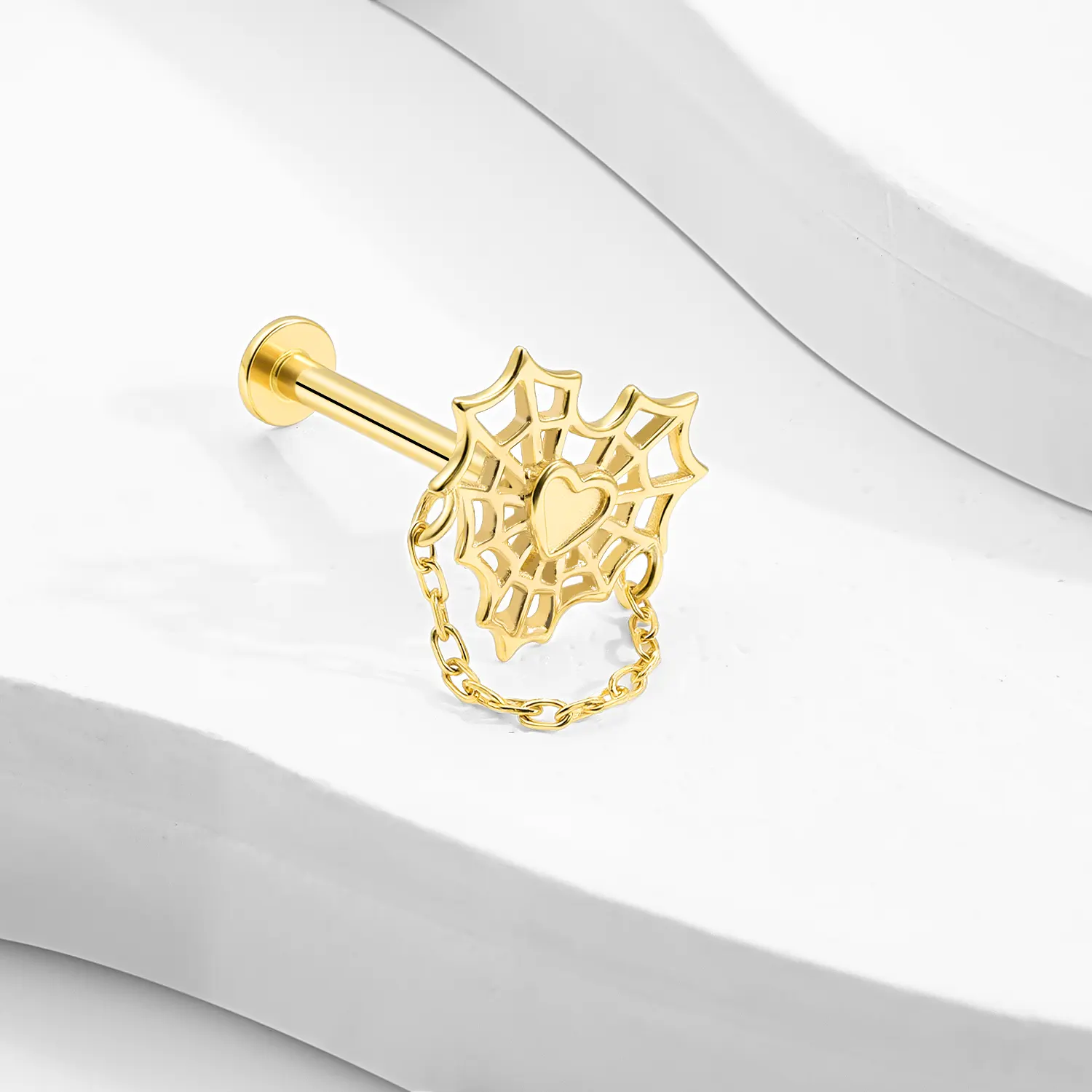 Introducing GUE31197G: A bold and playful threadless labret stud crafted in 14K solid gold, showcasing a heart-shaped spider web and delicate draping chain. A daring twist on body piercing jewelry that blends edge with sweetness.