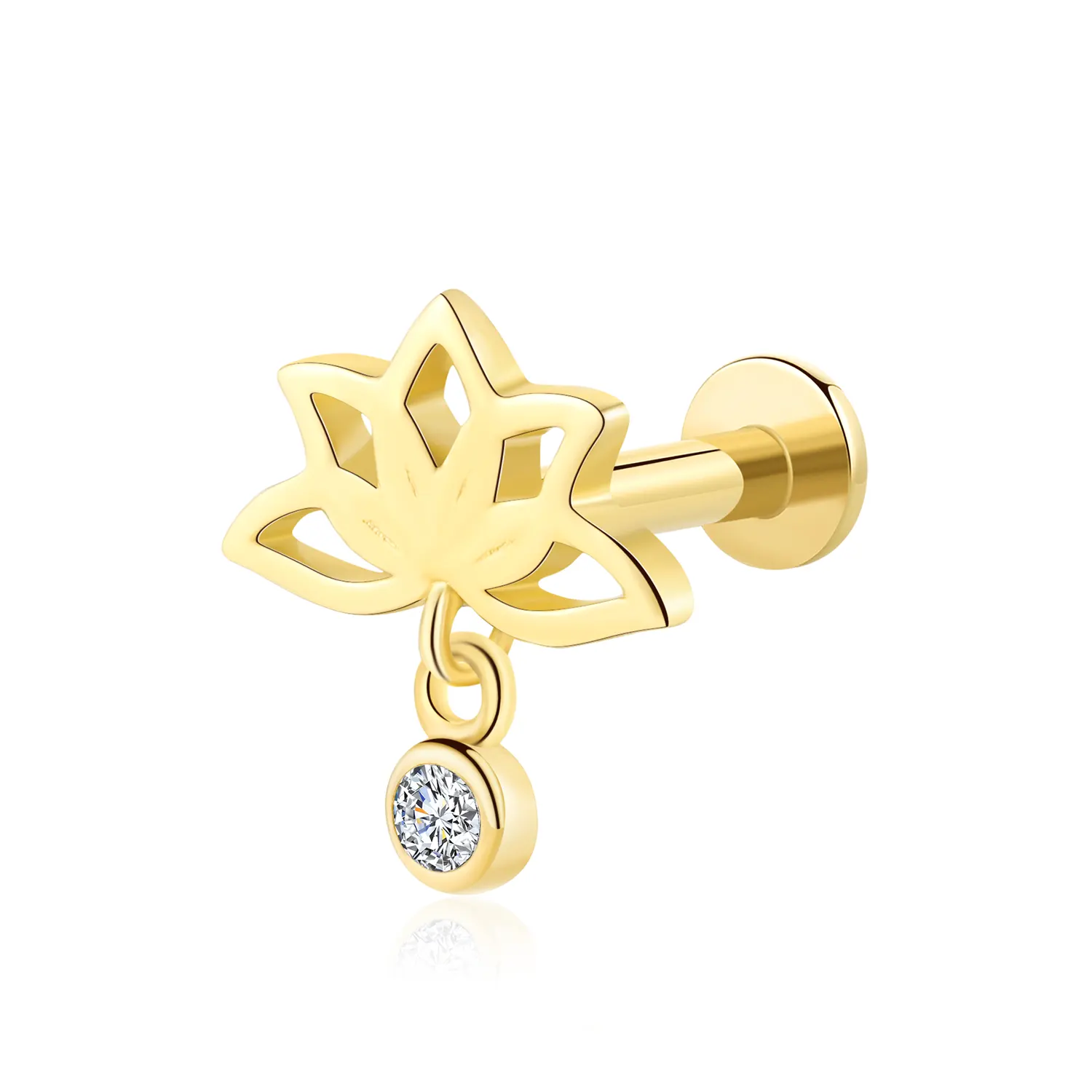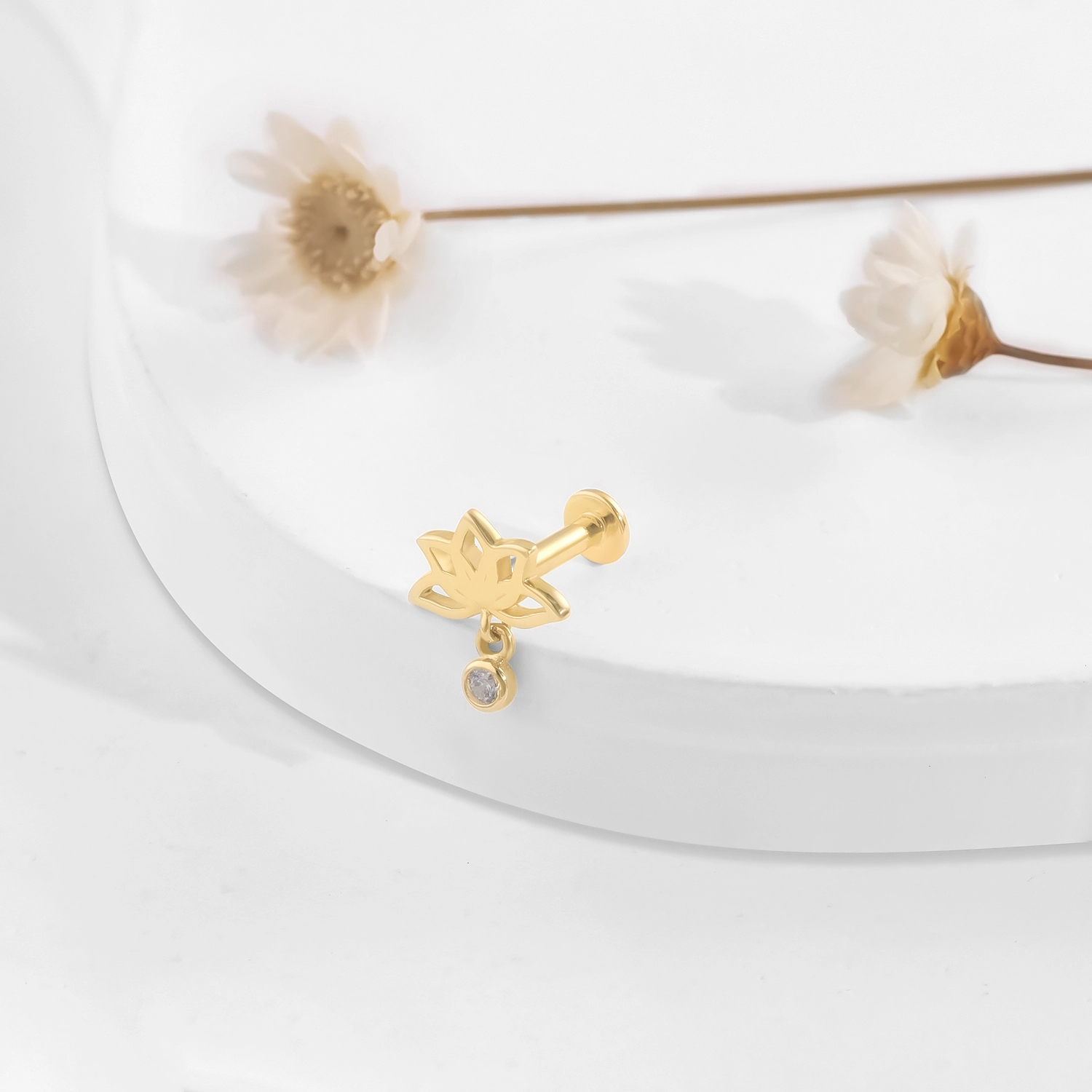 Introducing GUE430G: A 14K solid gold threadless labret stud featuring a beautiful lotus design with a round CZ dangle. This elegant and secure piece uses a steel push pin, perfect for any body piercing enthusiast seeking a blend of spirituality and sophistication.