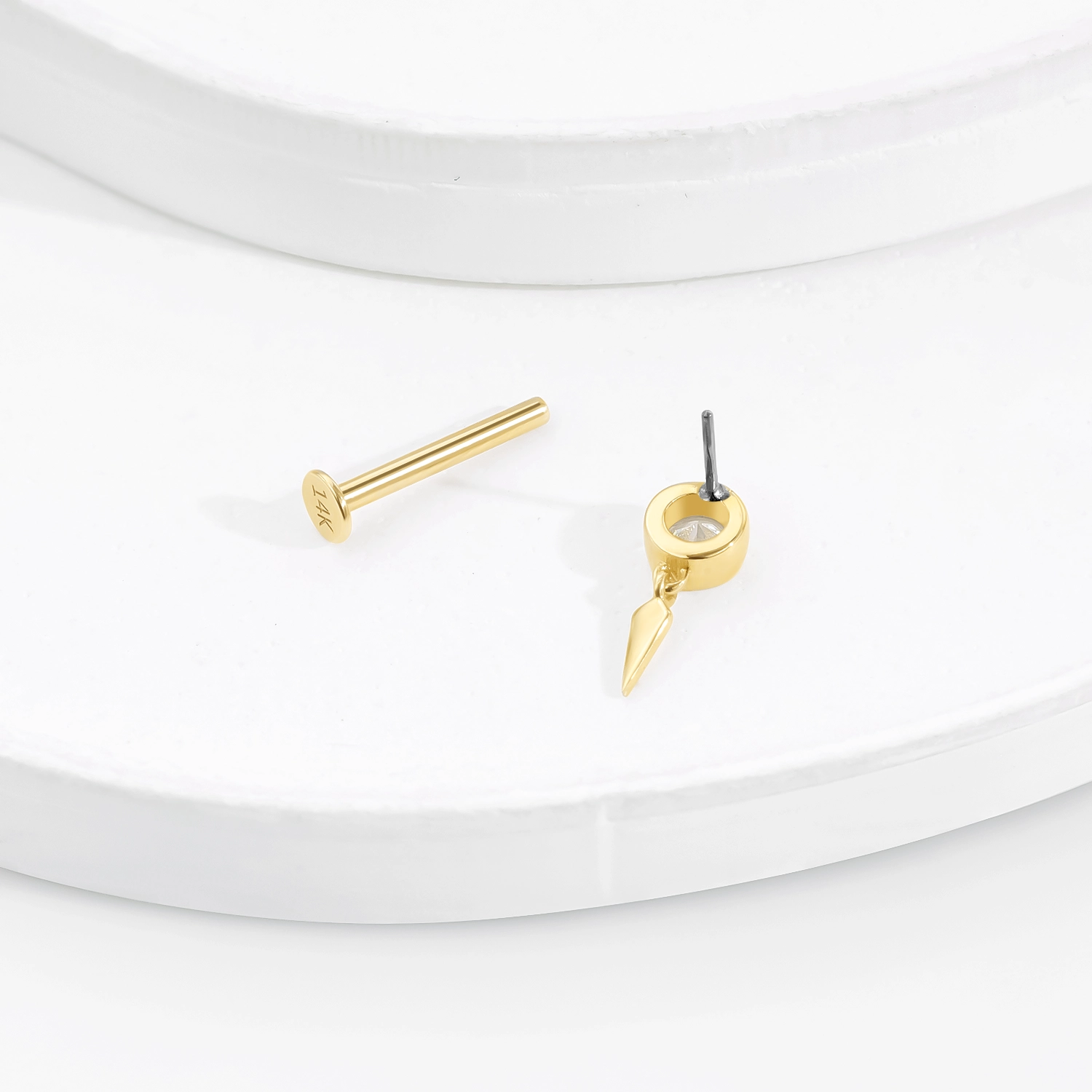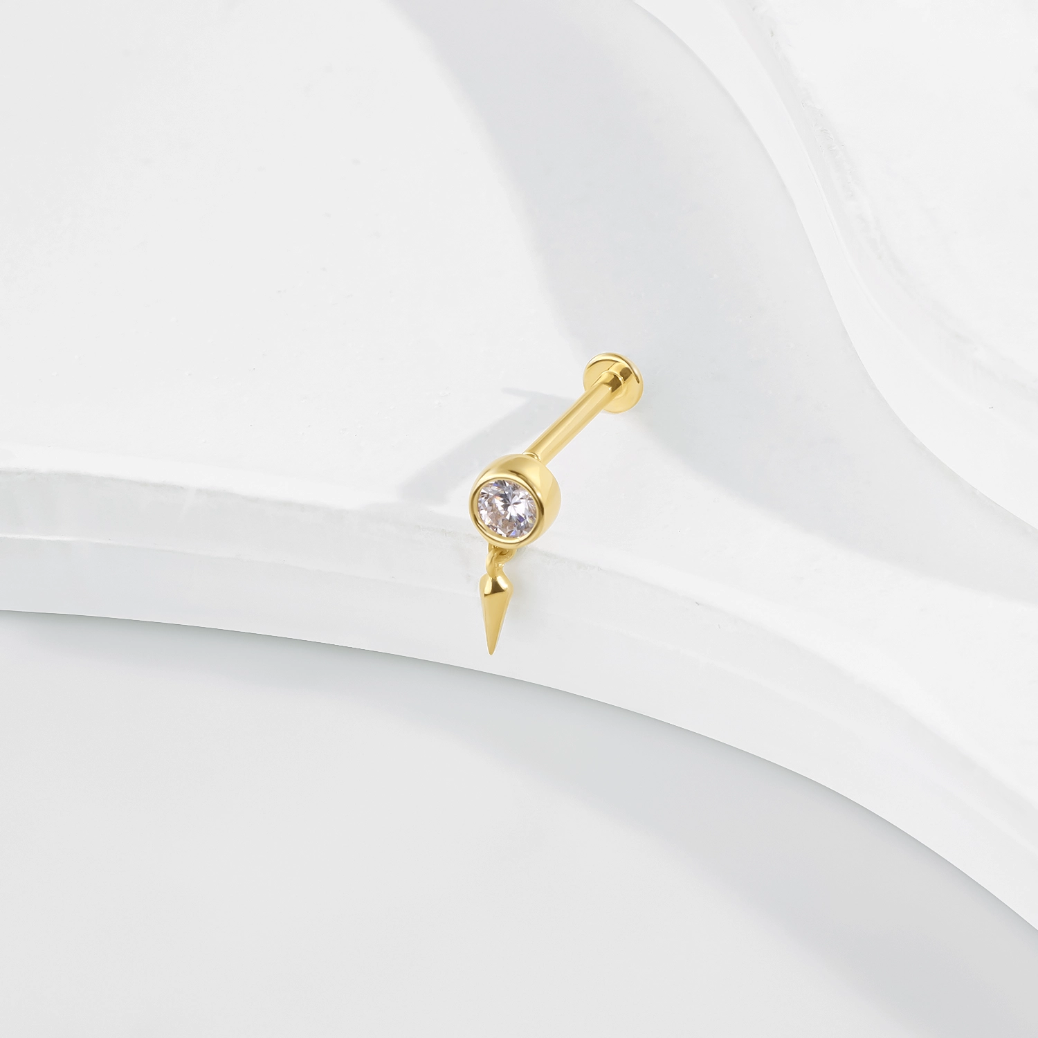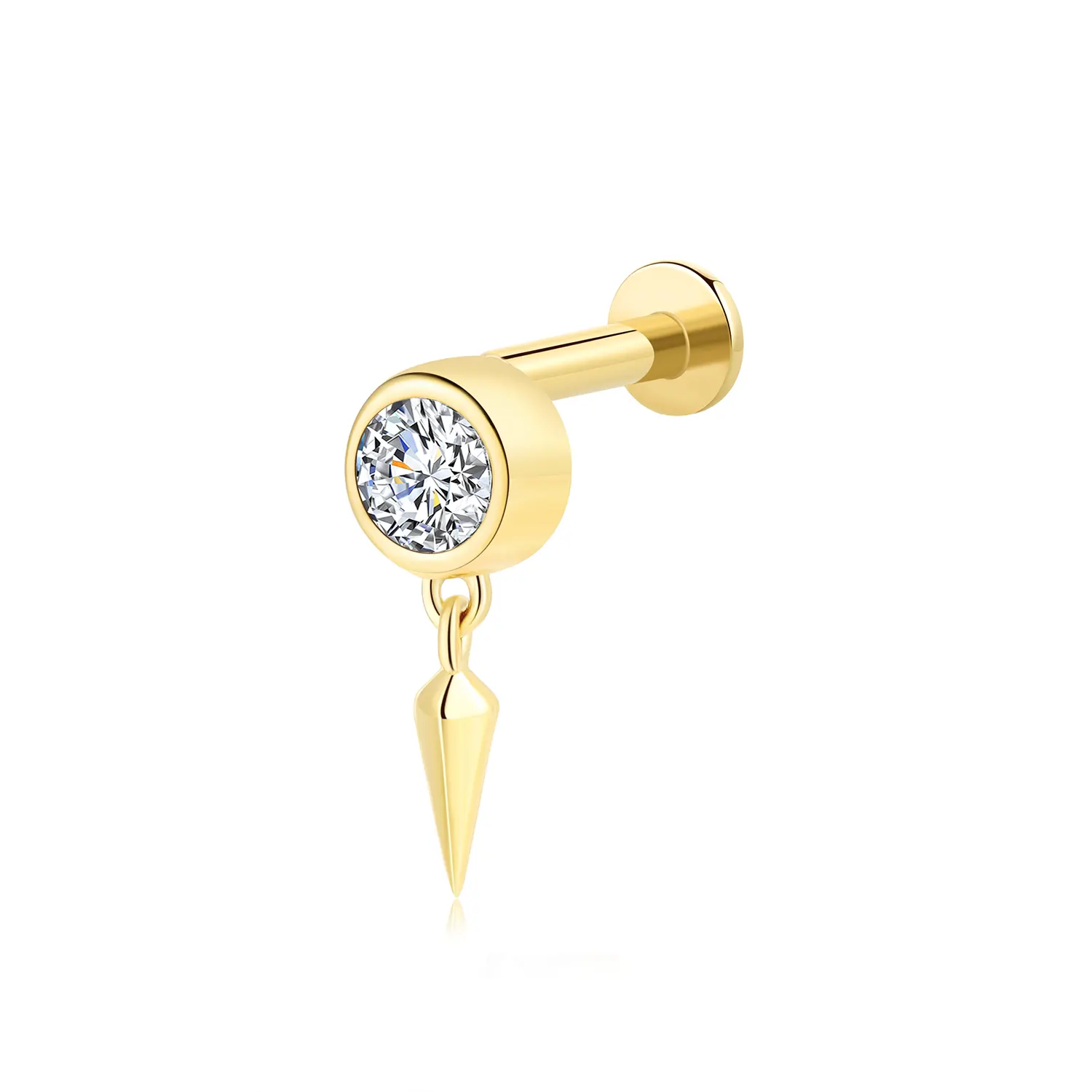 Introducing GUB2438G: A 14K solid gold threadless labret stud featuring a round CZ stone and a striking spike pendant. This elegant and secure piece uses a steel push pin, perfect for any body piercing enthusiast seeking a unique and stylish design.
