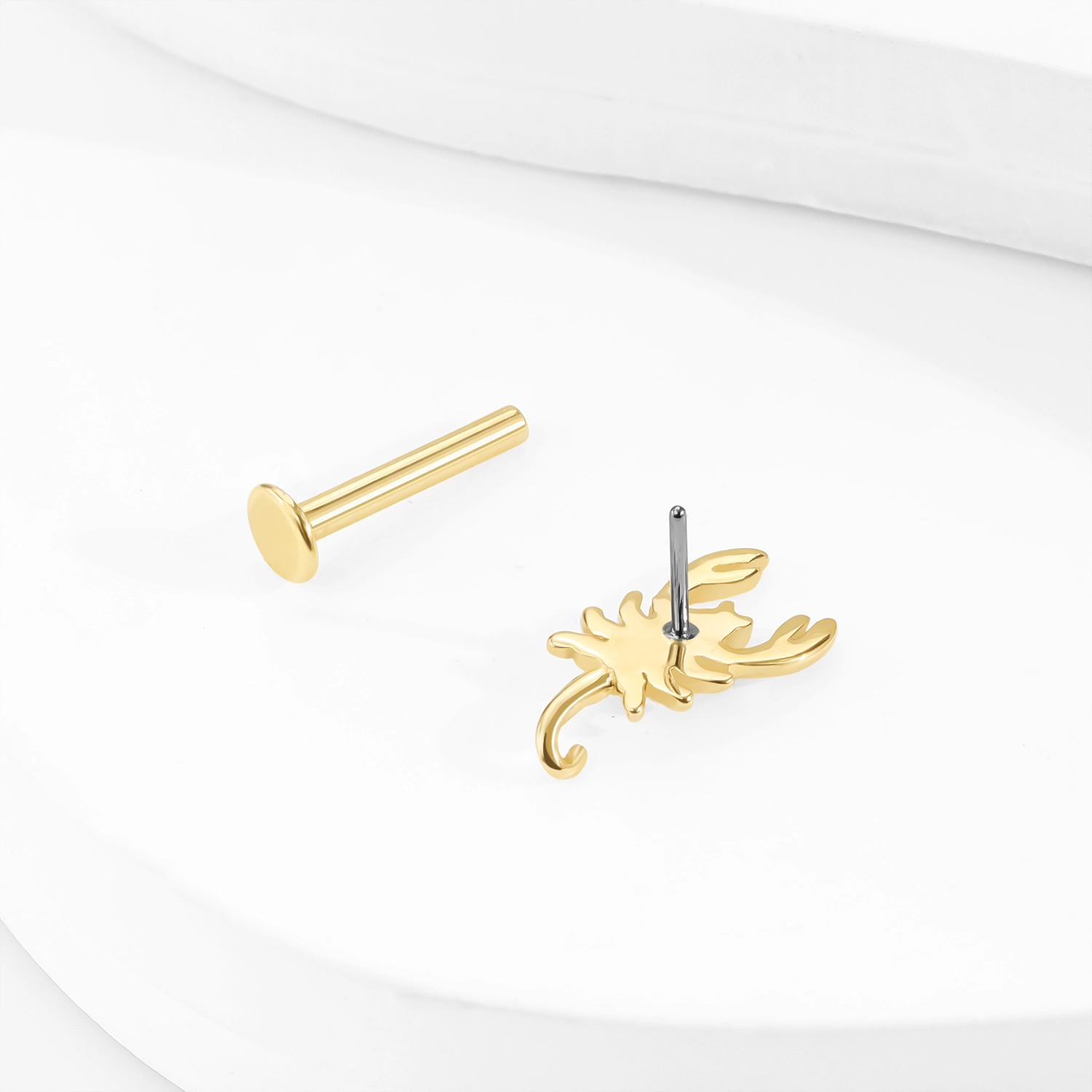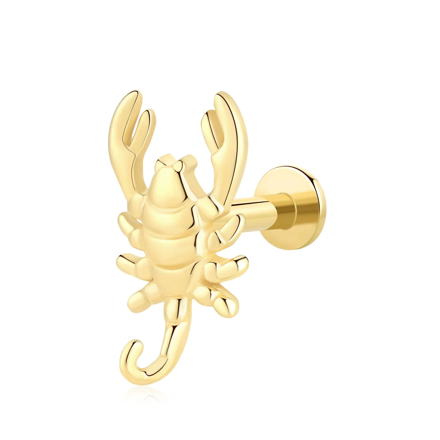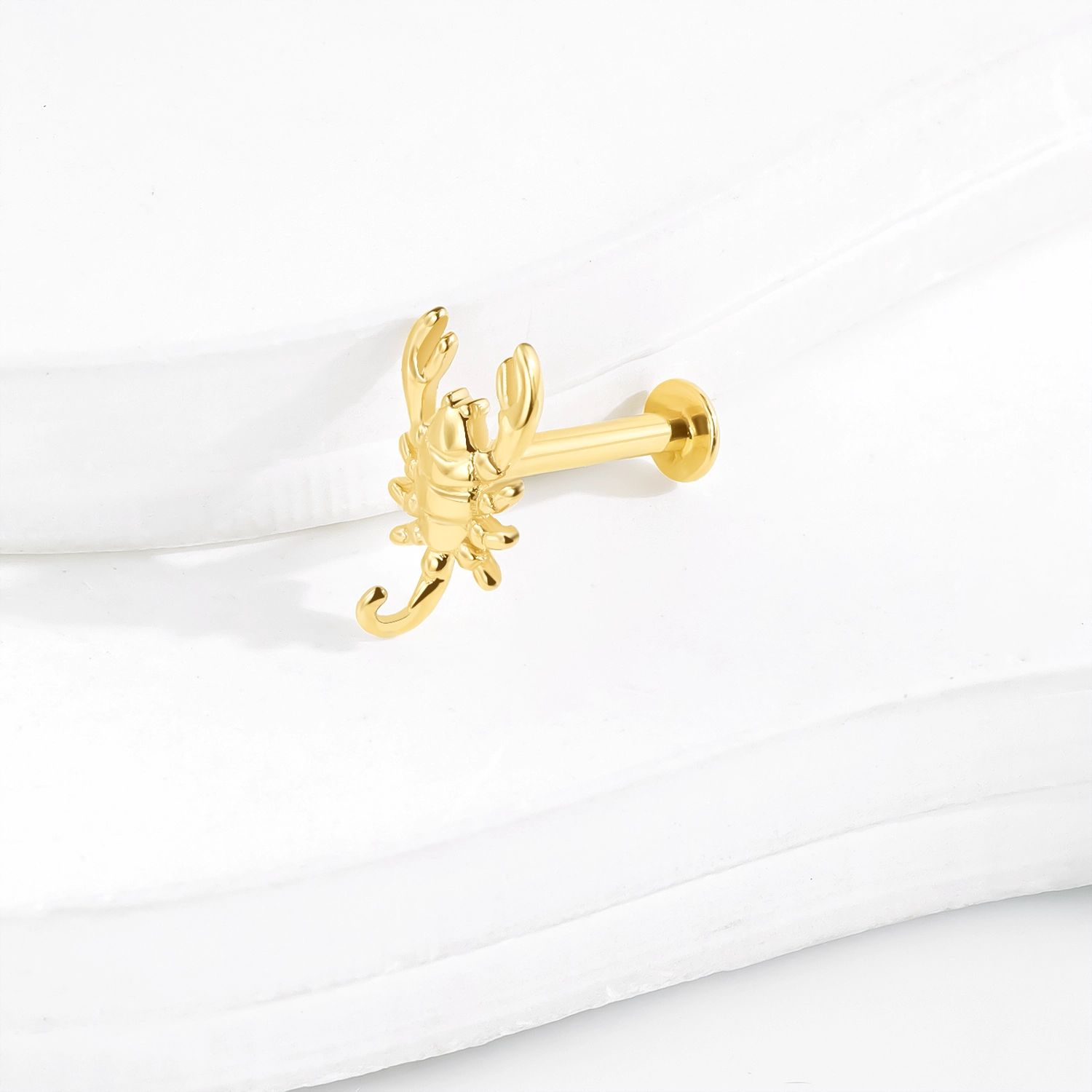Introducing the GUE40340G, a bold 14K solid gold threadless labret stud crafted in a striking scorpion shape. This intricately detailed piece combines edgy style with luxury, making it perfect for cartilage, tragus, or lip piercings. Featuring a secure steel push-pin mechanism, it offers both comfort and durability for everyday wear.