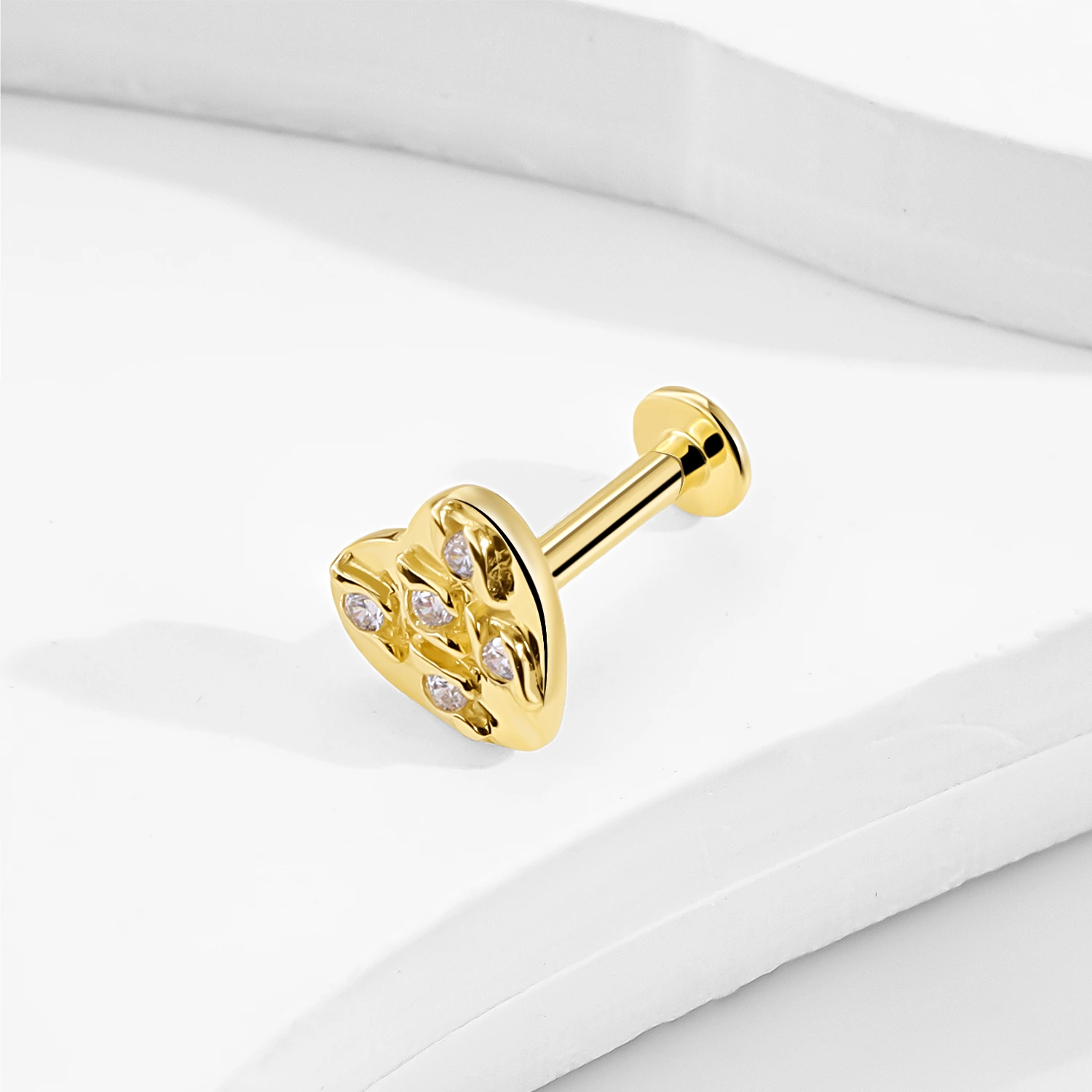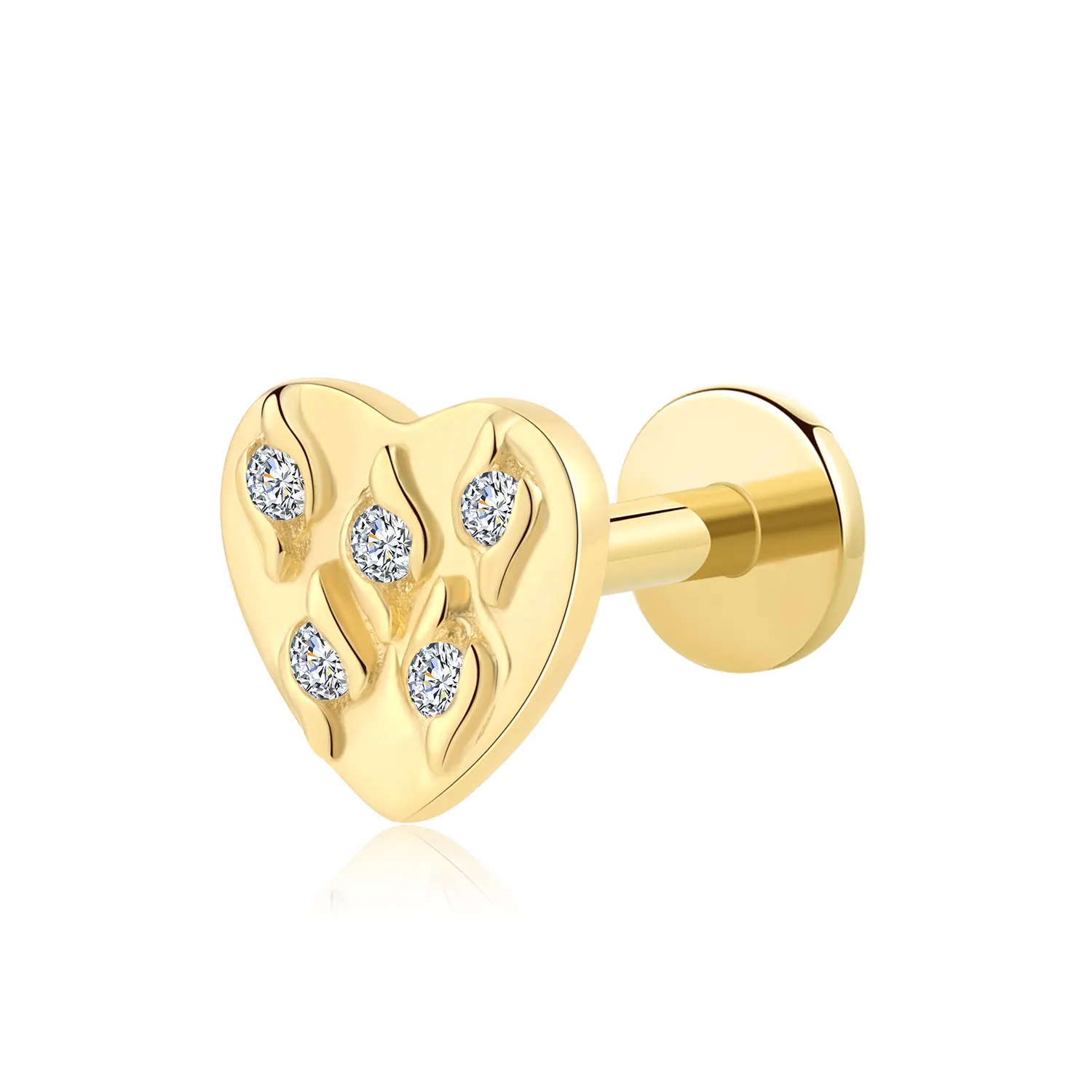 Introducing GUB2311218G – a threadless labret stud crafted from 14K solid gold, featuring a sculpted heart with five inset CZ stones nestled in curved grooves, offering charm with subtle brilliance.