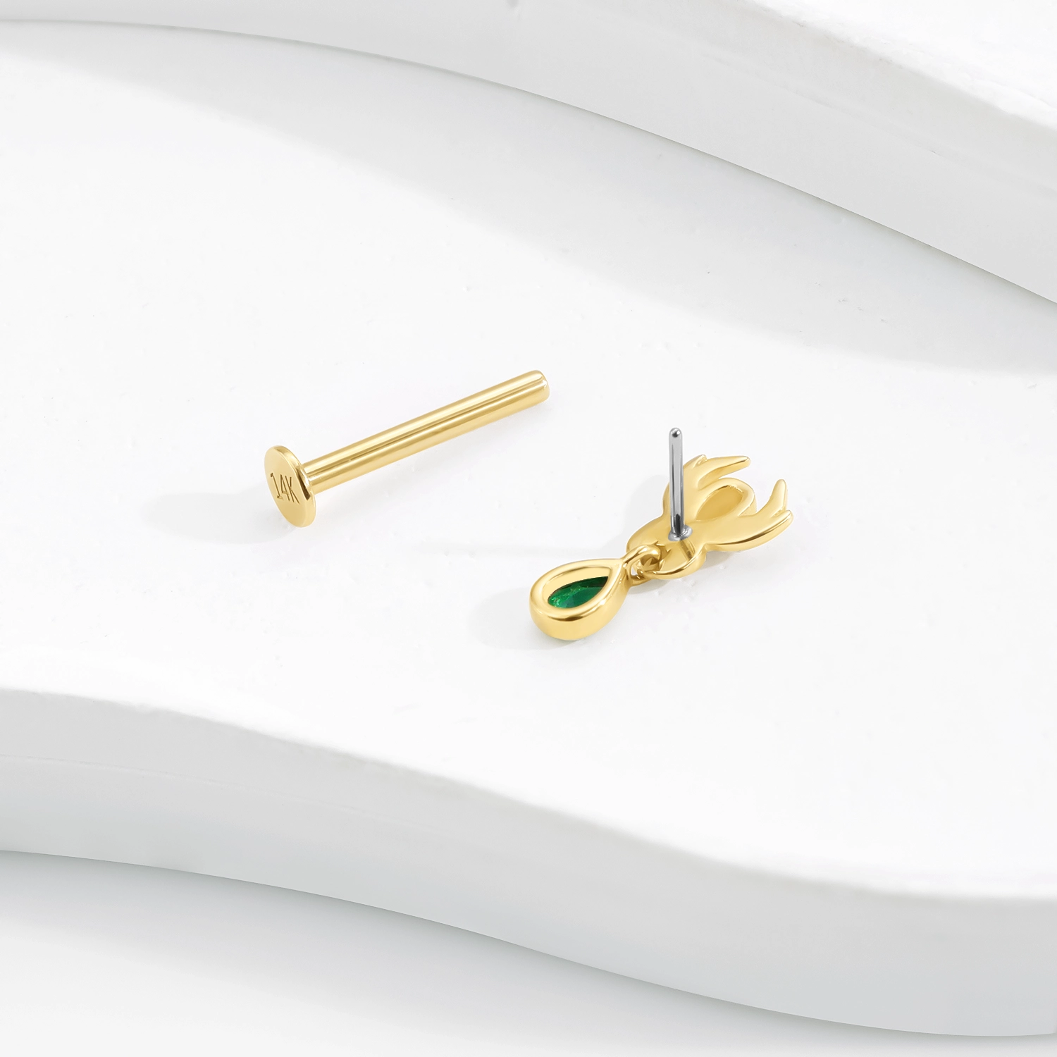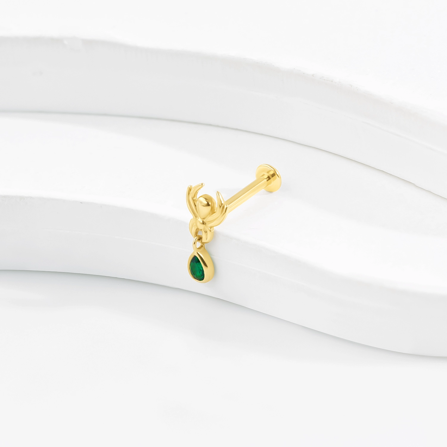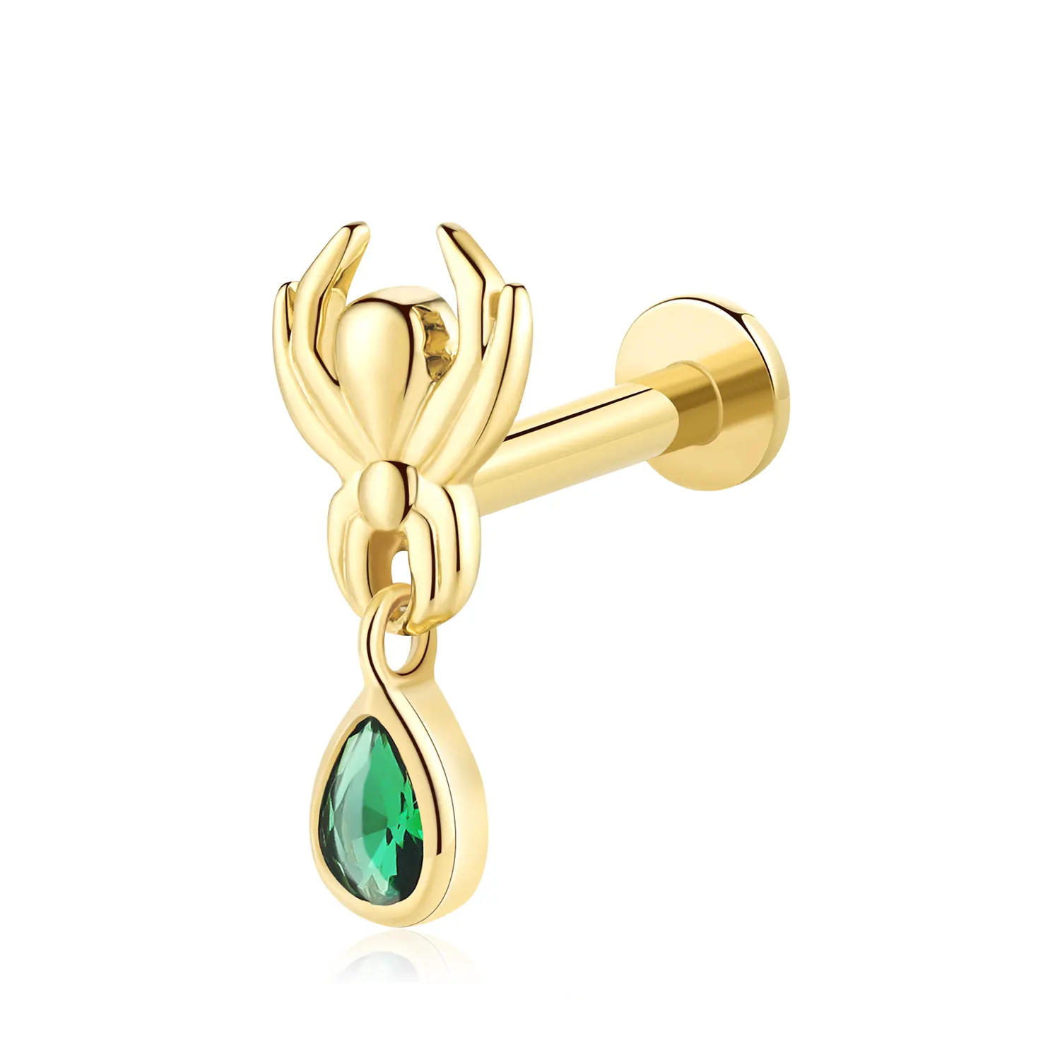Introducing the GUE0637G, a remarkable piece of body jewelry that blends the luxurious appeal of 14K solid gold with a bold and distinctive design. This threadless labret stud showcases an intricately crafted spider, symbolizing creativity and mystery, adorned with a captivating green teardrop CZ pendant that adds a vibrant touch to your look. The threadless design ensures a seamless and secure fit, complemented by a durable steel push pin for easy application and removal. Ideal for various body piercings, this labret stud offers both beauty and functionality. The combination of the spider motif and the dazzling green CZ drop creates a statement piece that is perfect for enhancing both everyday styles and special occasion outfits. Add the GUE0637G threadless labret stud to your jewelry collection and experience the perfect blend of luxury and unique artistry, designed to highlight your individuality and bold sense of style.