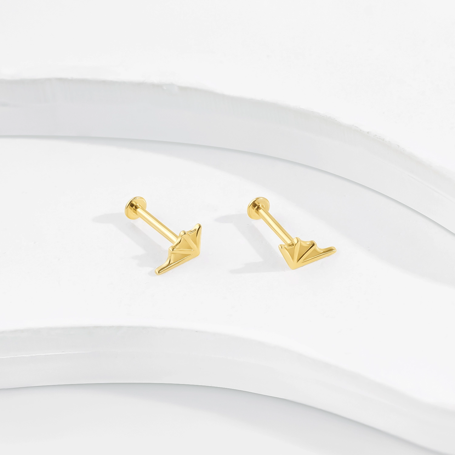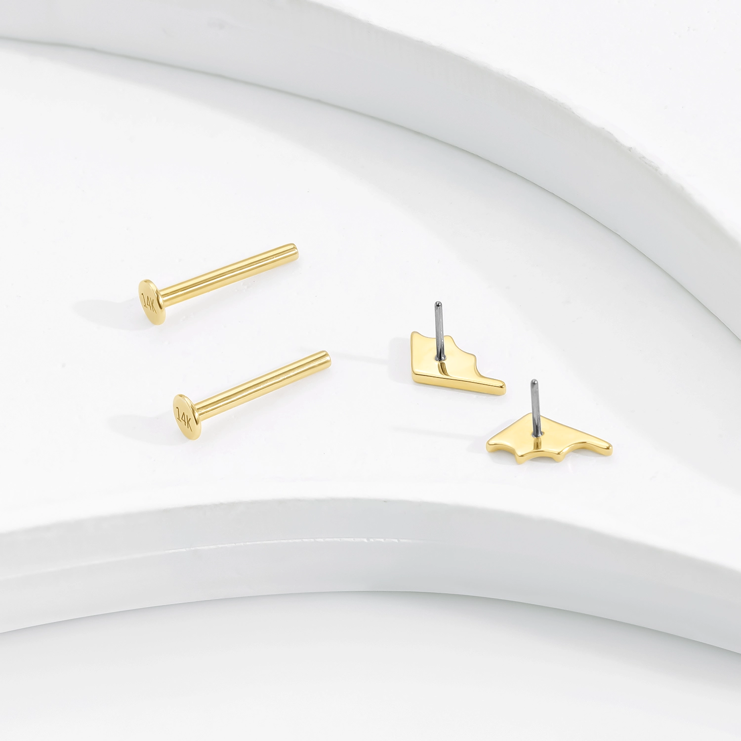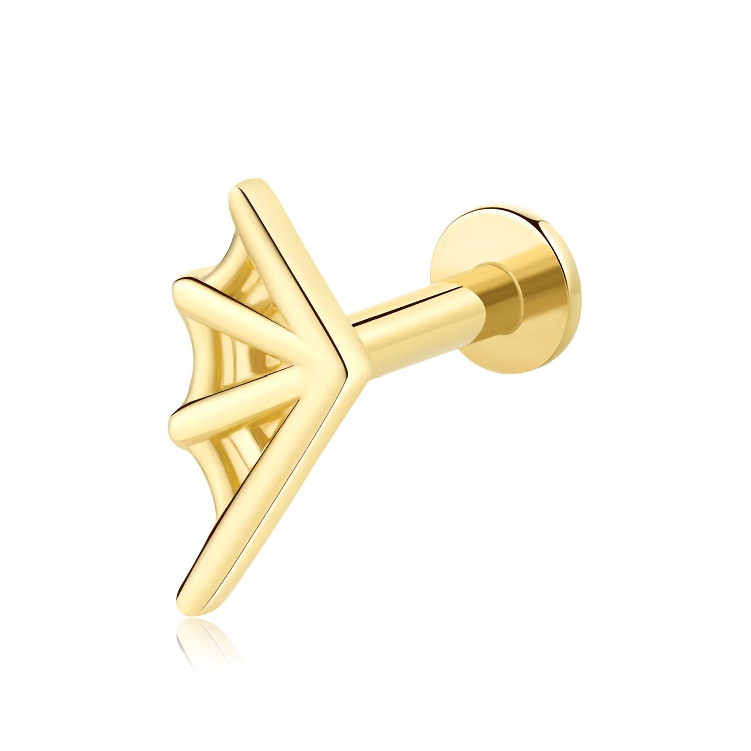 Introducing GUE2714G: A 14K solid gold threadless labret stud featuring a unique spider web design, available in left and right variations. This elegant and secure piece uses a steel push pin, perfect for any body piercing enthusiast seeking a stylish and edgy look.