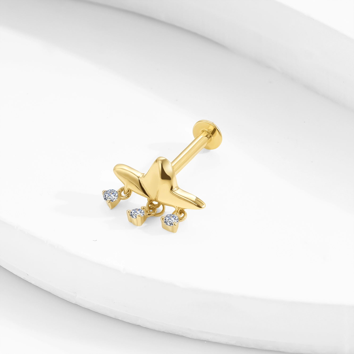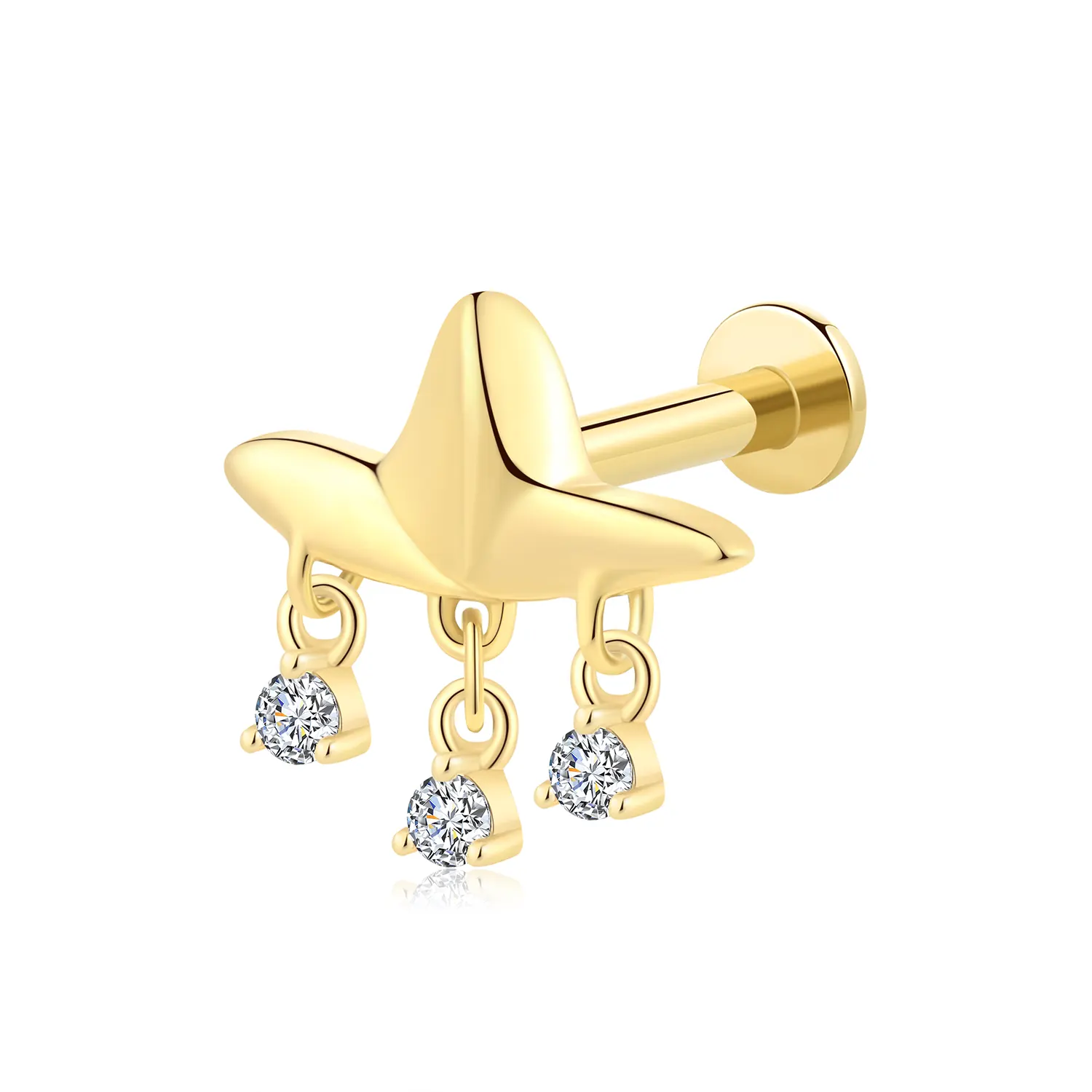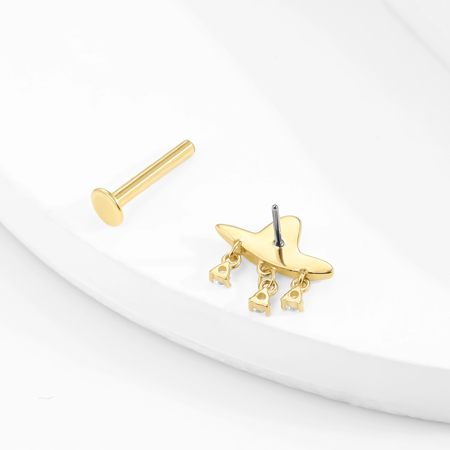 Introducing the GUB43321G, a playful yet elegant 14K solid gold threadless labret stud. Featuring a polished star design with three dangling CZ stones, this piece offers captivating movement and sparkle. The steel push-pin mechanism ensures secure and comfortable wear, perfect for cartilage, tragus, or lip piercings.
