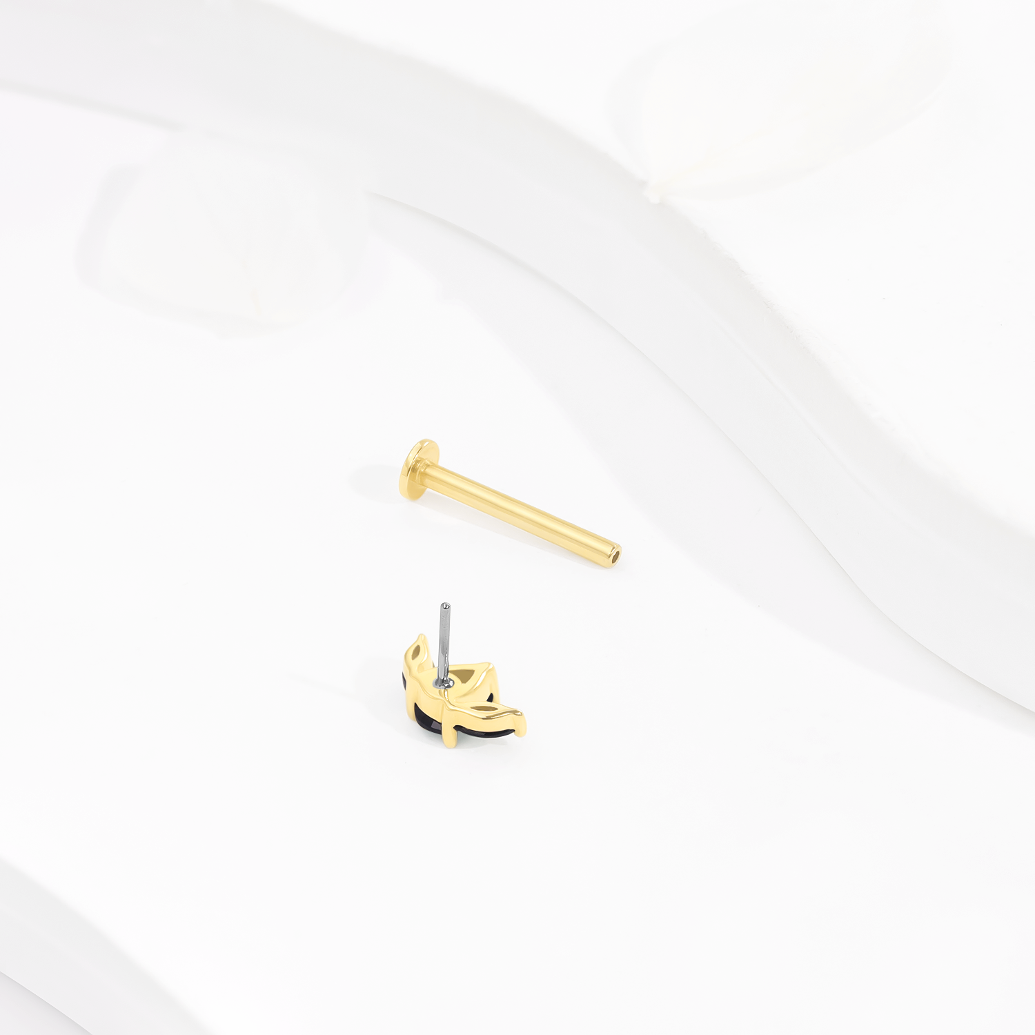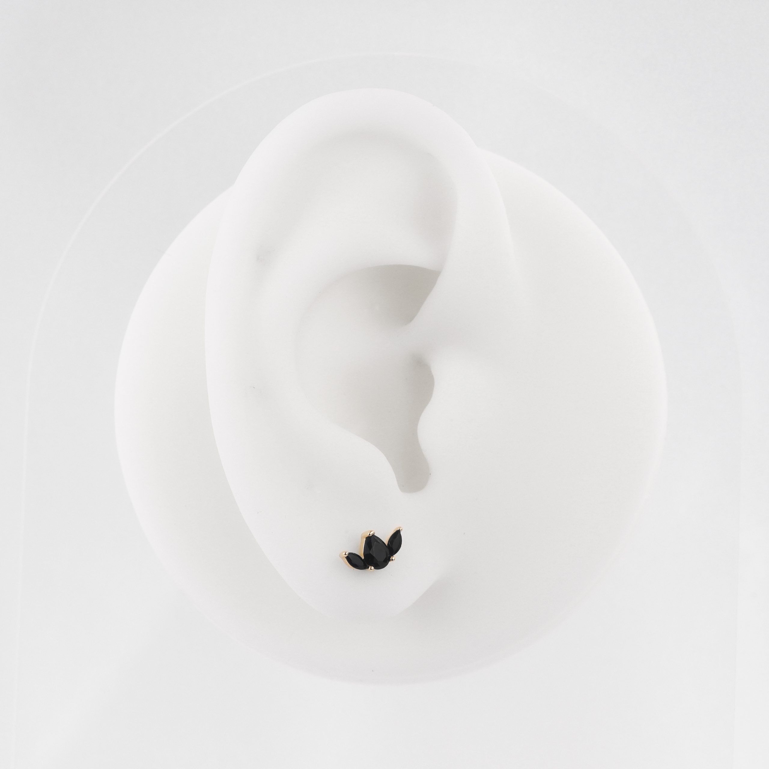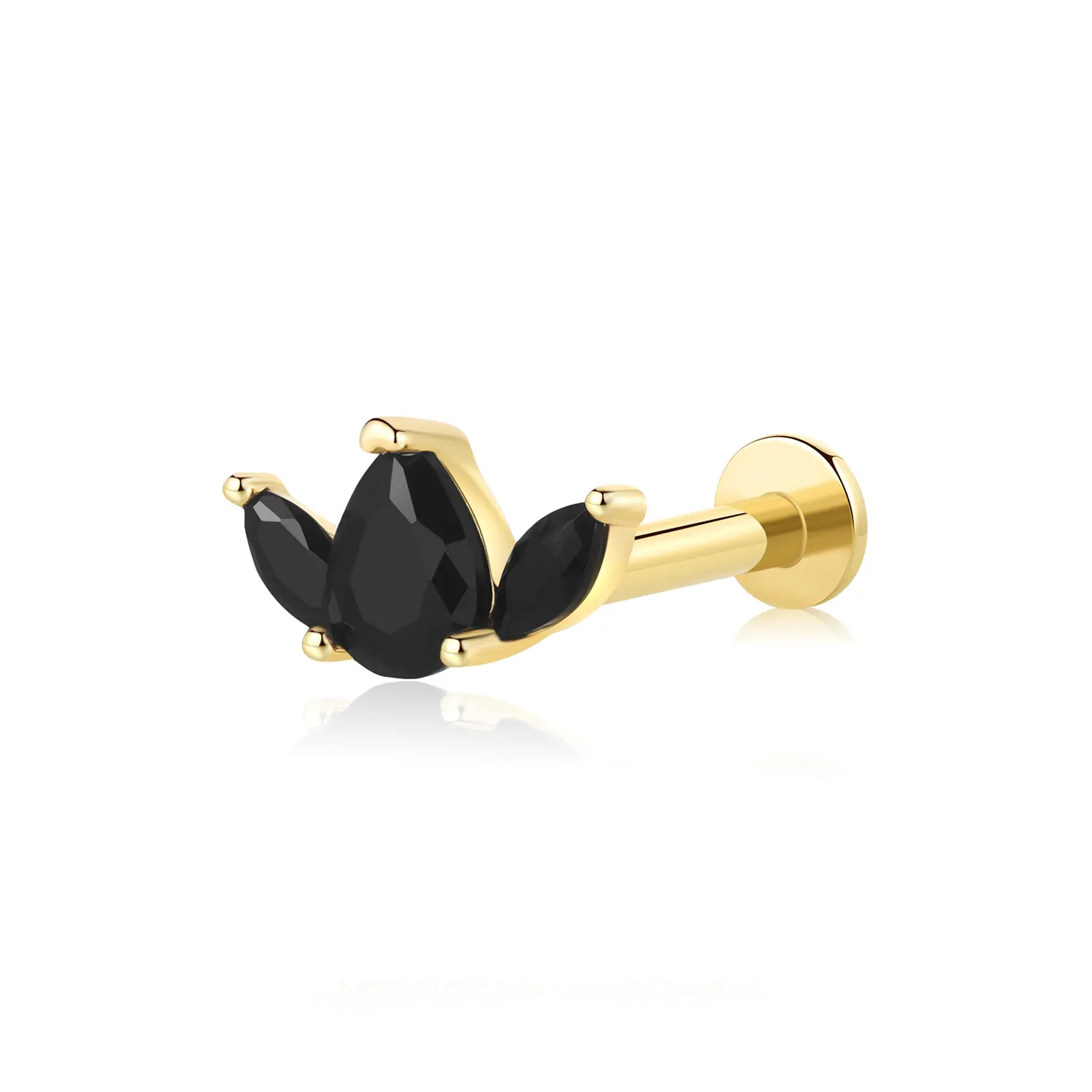 Introducing GU222G, a 14K solid gold threadless labret stud featuring three stunning black CZ stones. This unique and elegant piece adds a touch of sophistication and mystery to your body jewelry collection, perfect for any occasion.