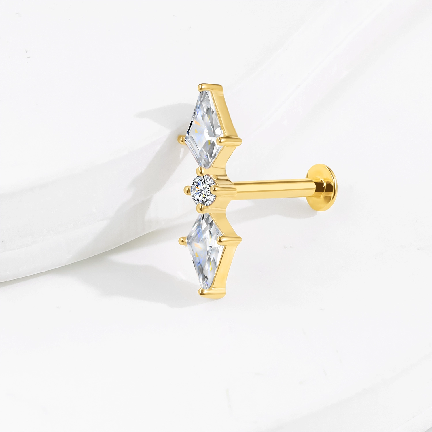 14K Solid Gold Threadless Labret Stud with Vertical Diamond-Shaped CZ Design