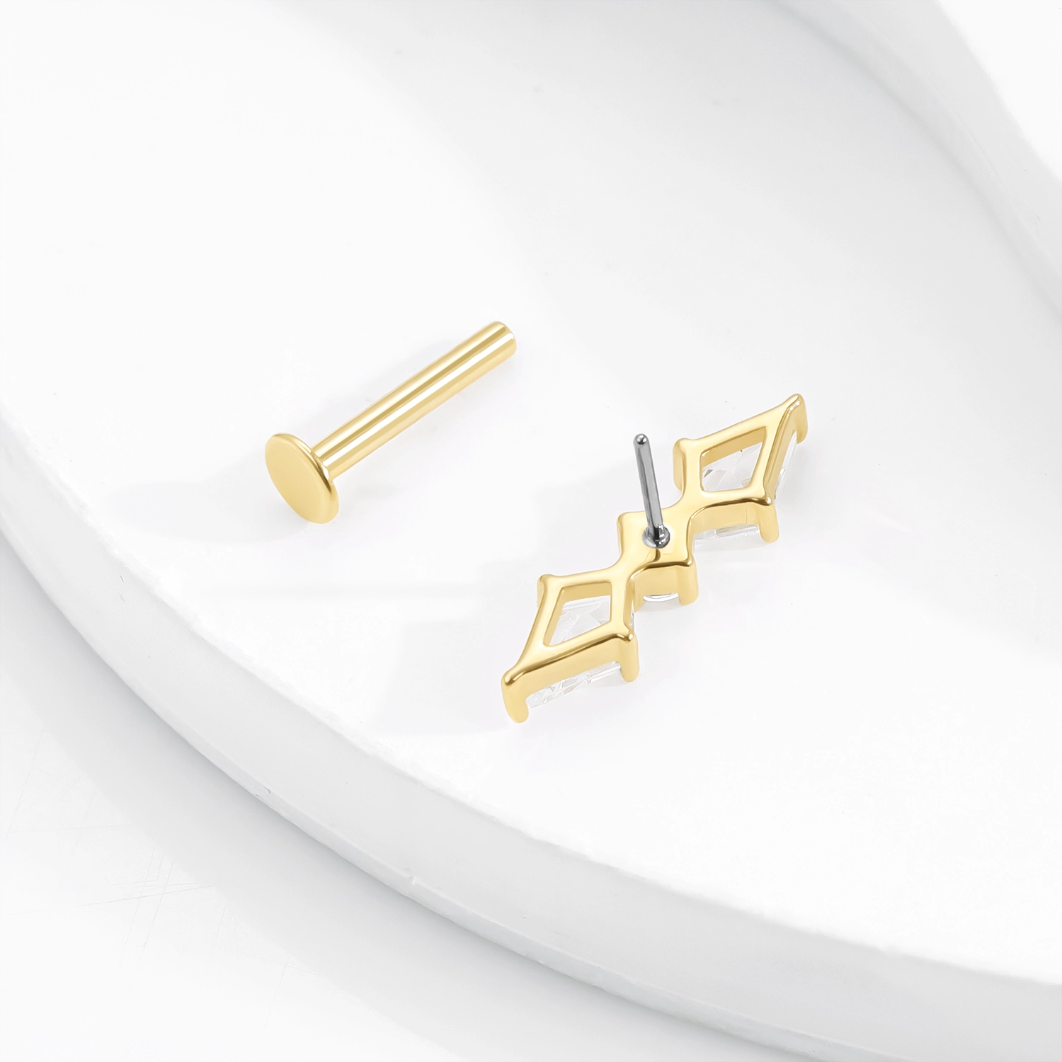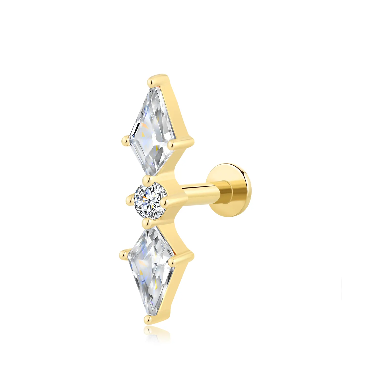 Introducing the GUE40443G, a striking 14K solid gold threadless labret stud with a vertical geometric design. Featuring two diamond-shaped CZ stones stacked above and below a round-cut CZ accent, this modern piece combines elegance with precision. The steel push-pin mechanism ensures secure, comfortable wear, ideal for cartilage, tragus, or lip piercings.