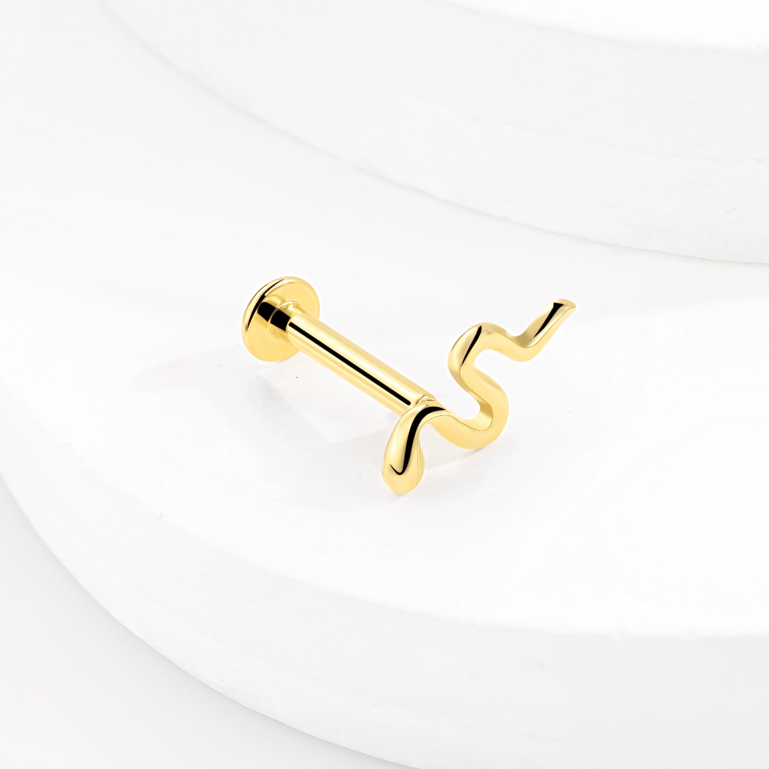 Introducing GU40445G-CL: A 14K solid gold threadless labret stud with a bold wavy shape and sleek curves, featuring a hidden CZ accent. Perfect for modern body piercing lovers.