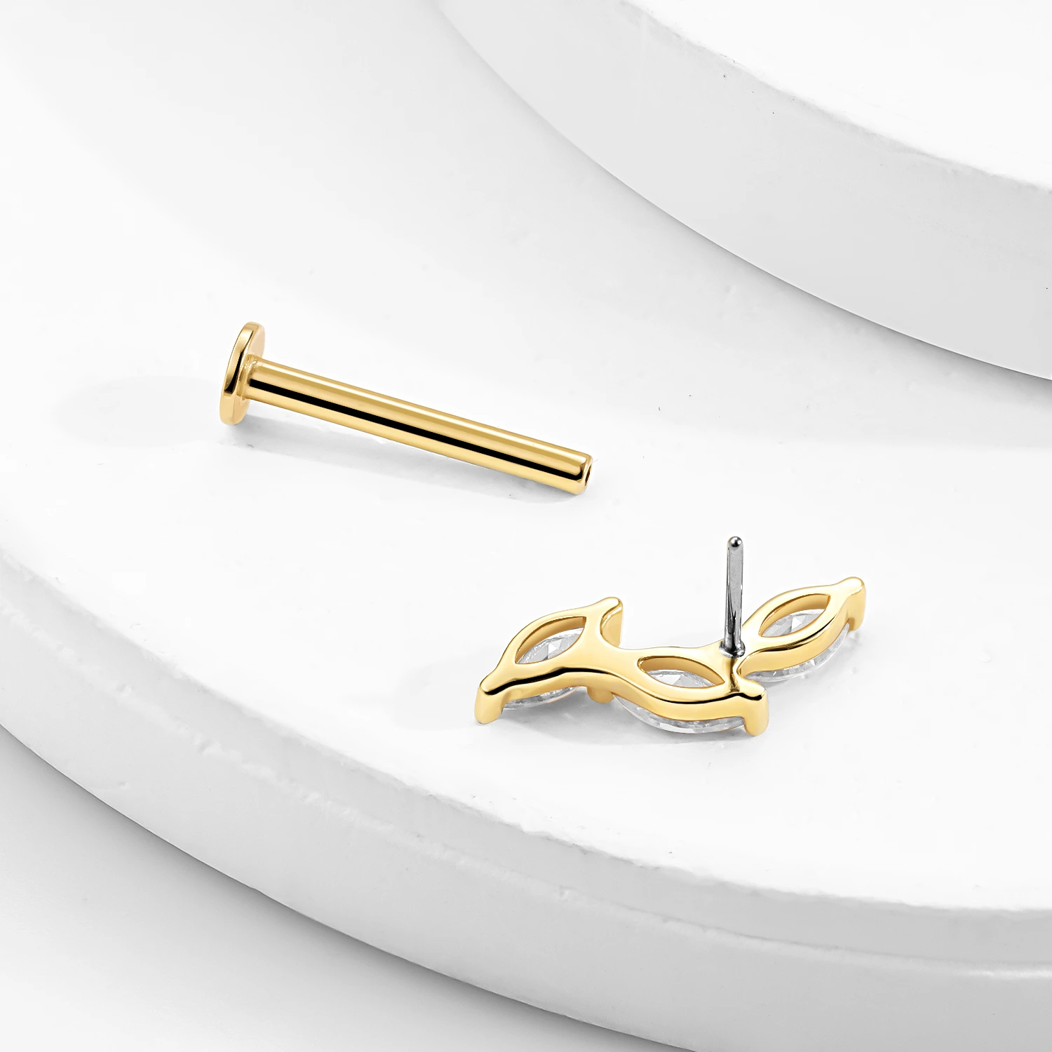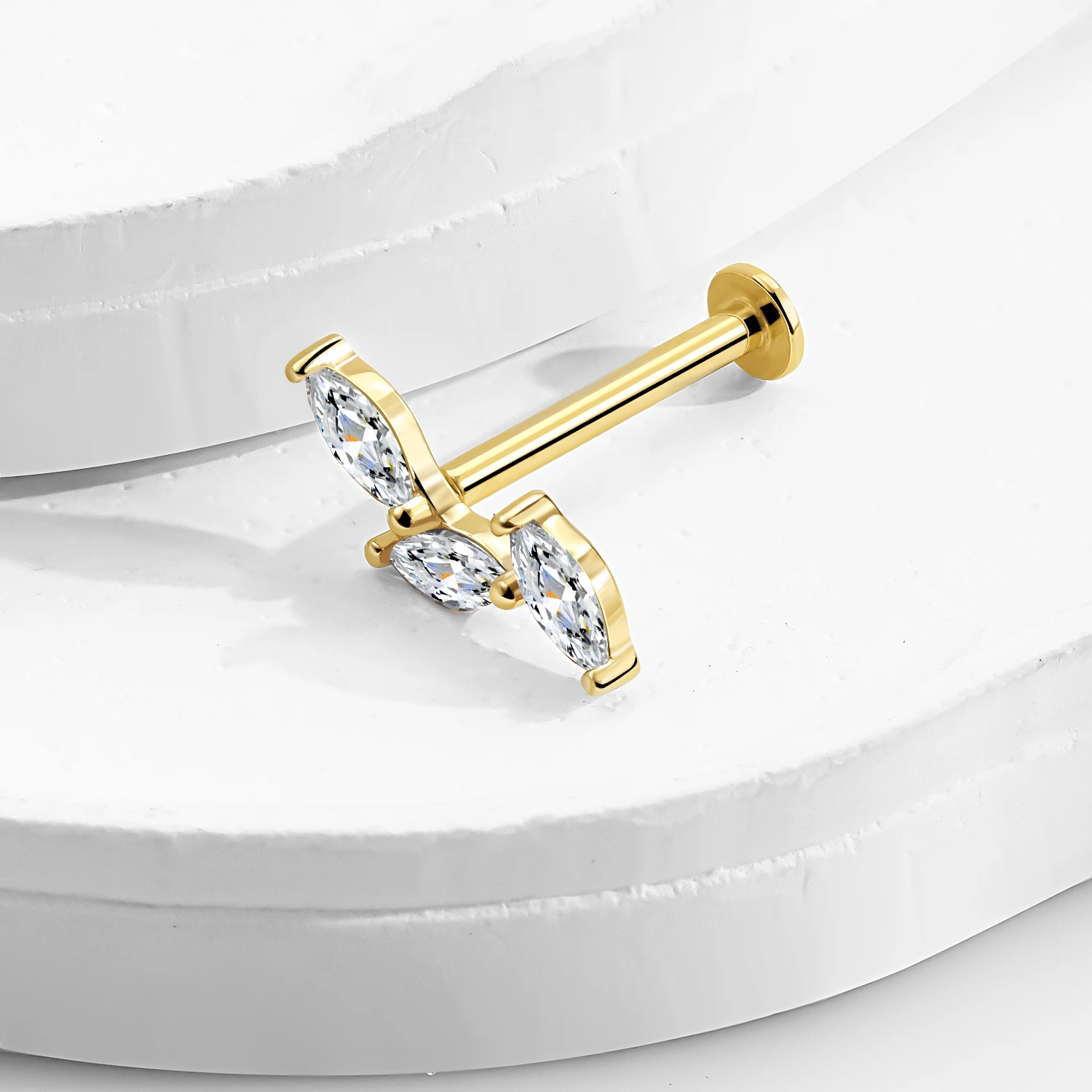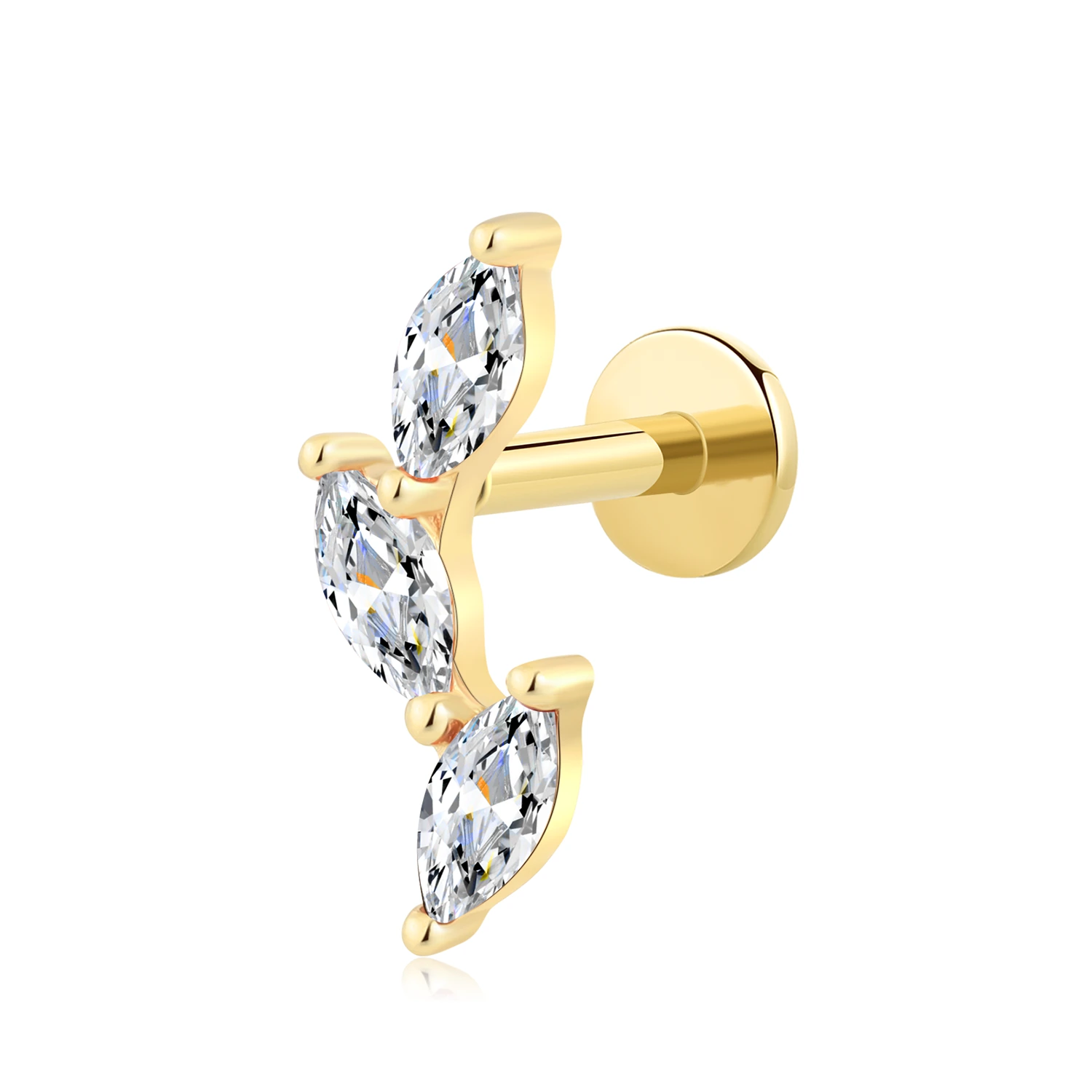 Introducing GUE3085G-CL – a dazzling piece of 14K gold piercing jewelry crafted for elegance and comfort. This threadless labret stud features a trio of marquise-cut CZ stones arranged in a graceful curve, offering a sophisticated sparkle for any ear or lip piercing. Made with a steel push pin and 14K solid gold, it combines durability with luxury. Perfect for your curated body jewelry collection, this piece is ideal for conch, helix, or tragus placements. A timeless choice for body piercing lovers.