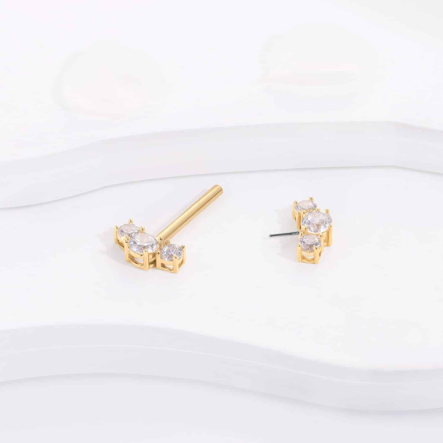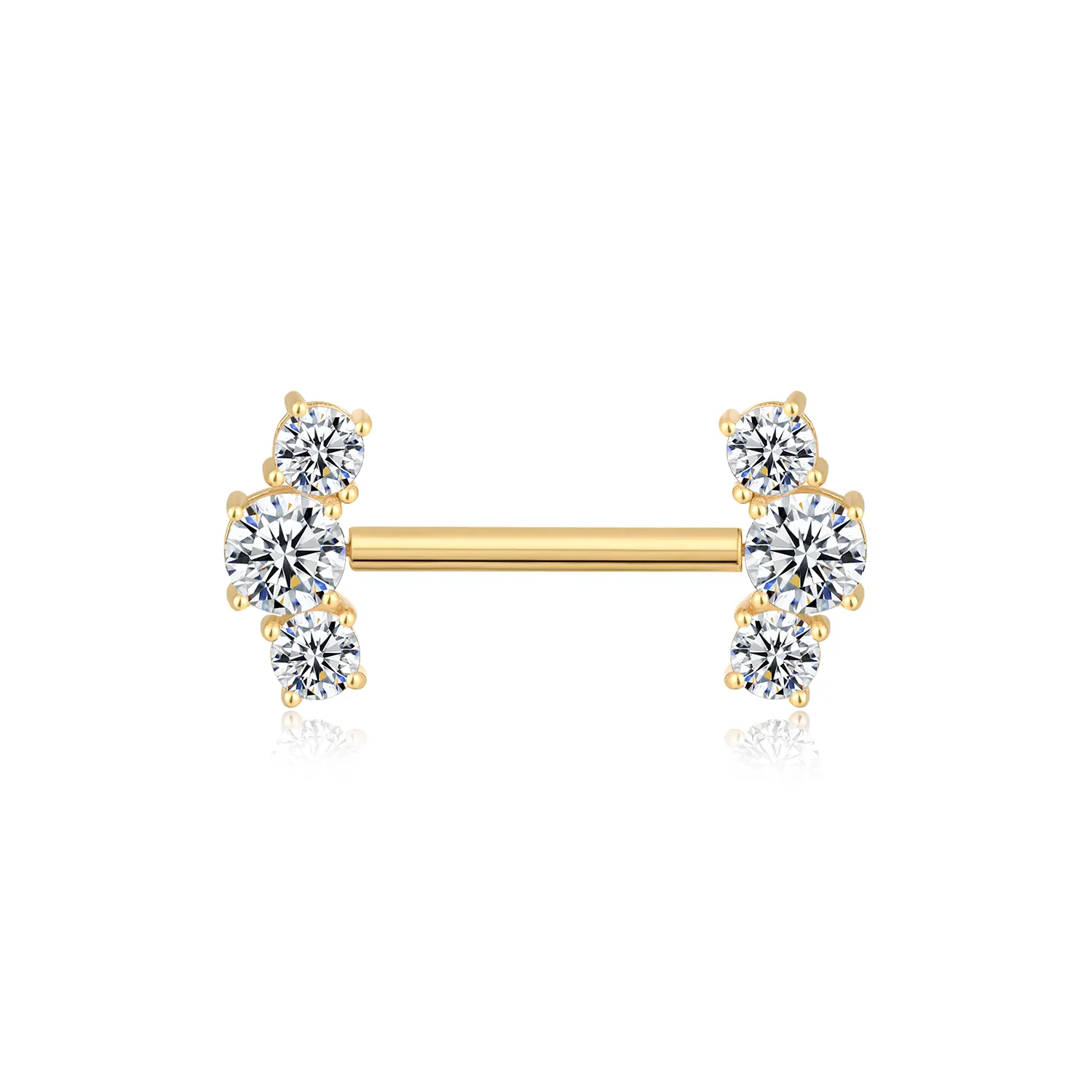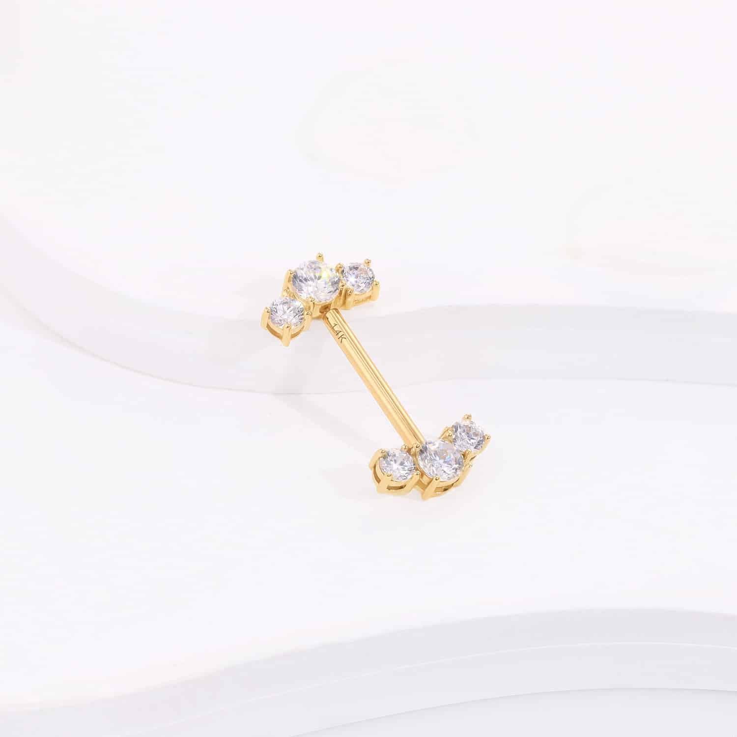 Unveil the elegance of GXH30407G, a 14k solid gold threadless nipple ring, featuring a steel pin for durability. Adorned with brilliant clear CZ stones, it offers a blend of strength and sparkle for a luxurious piercing experience.