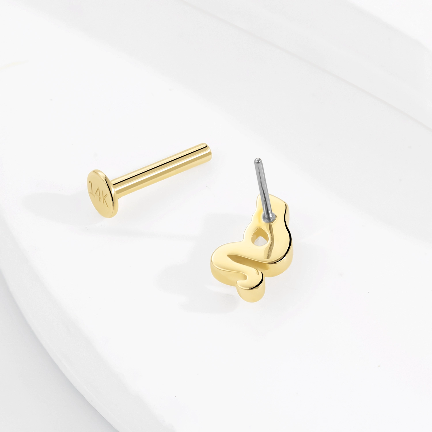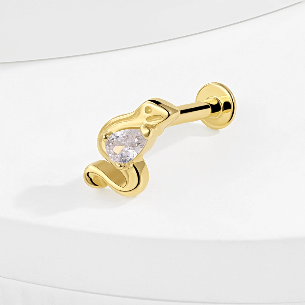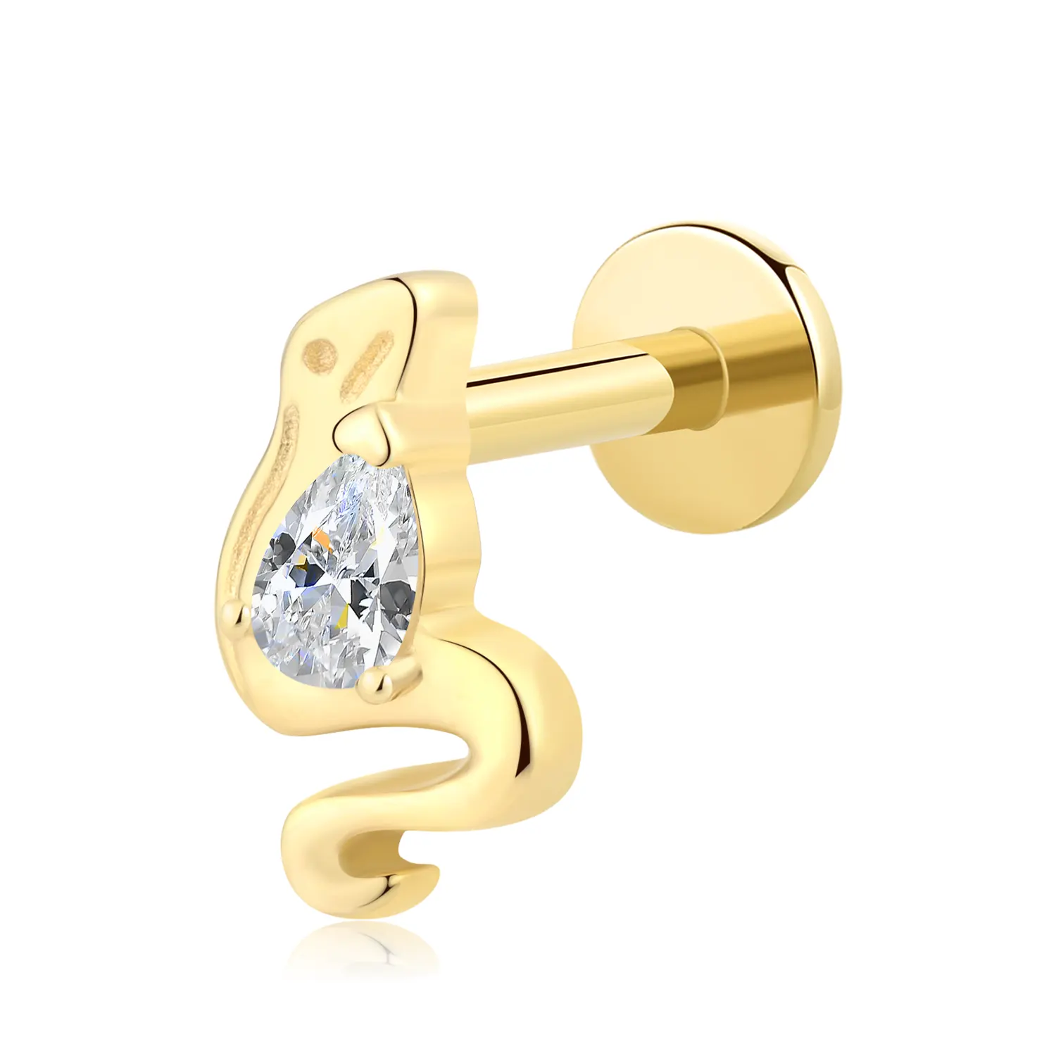 Introducing GUE31165G – a 14K solid gold threadless labret stud shaped like a coiled snake, featuring a brilliant pear-shaped CZ stone at its center. A bold and mystical piece of body piercing jewelry with secure steel push-pin backing.