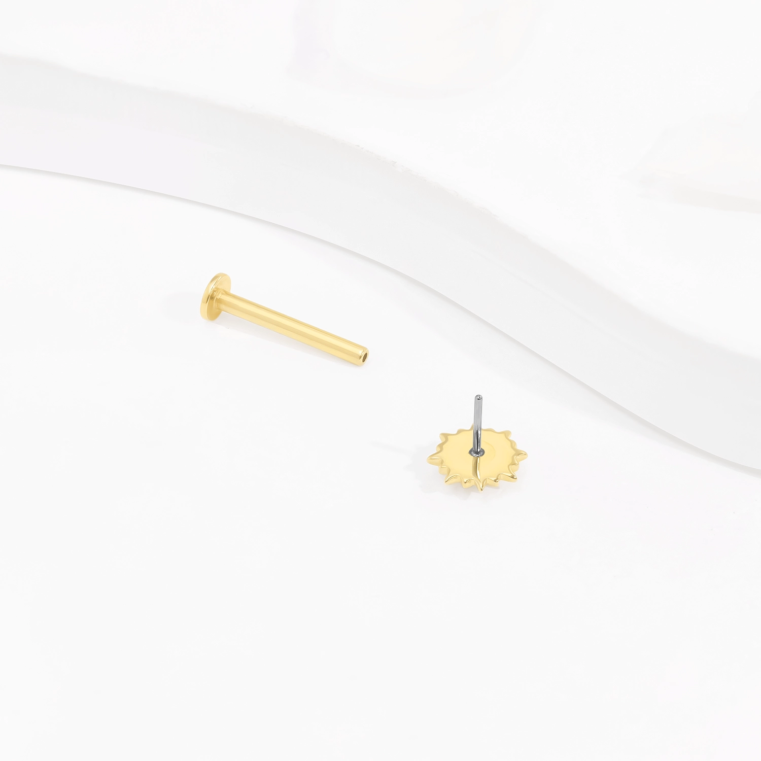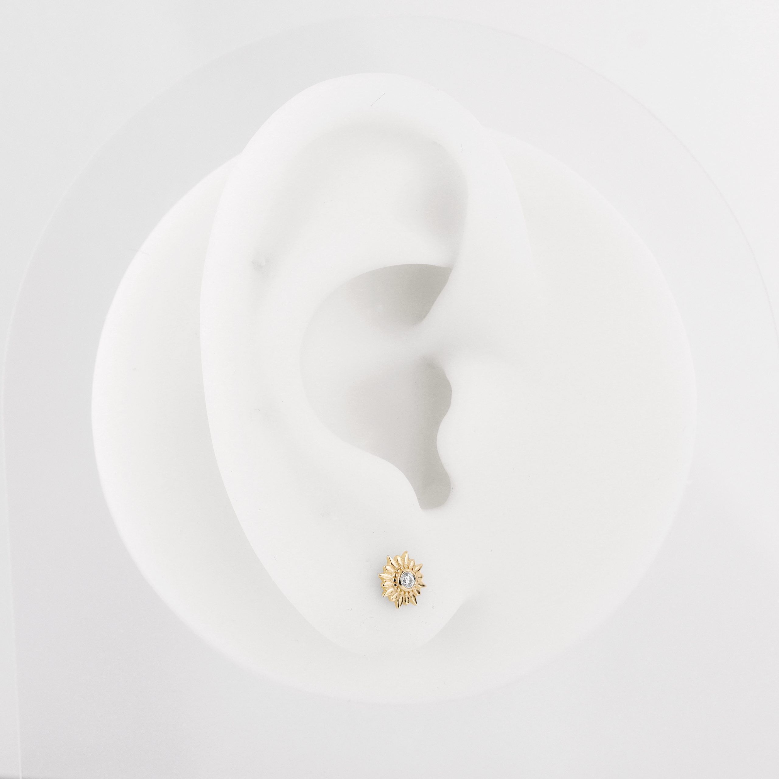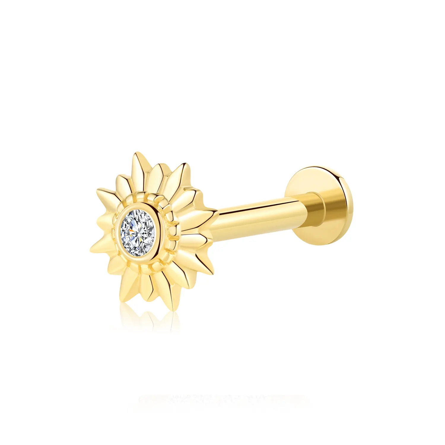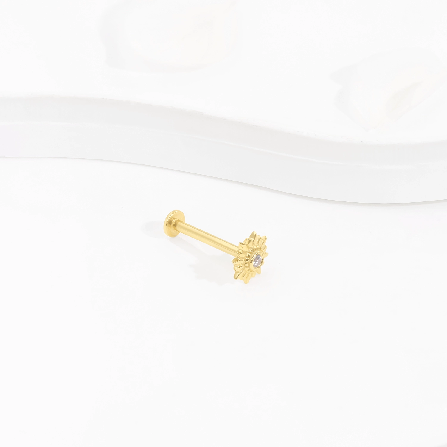 Introducing GU115G, a 14K solid gold threadless labret stud featuring a dazzling sun design with a sparkling CZ stone at its center. This exquisite piece adds a touch of radiant elegance to any body jewelry collection.