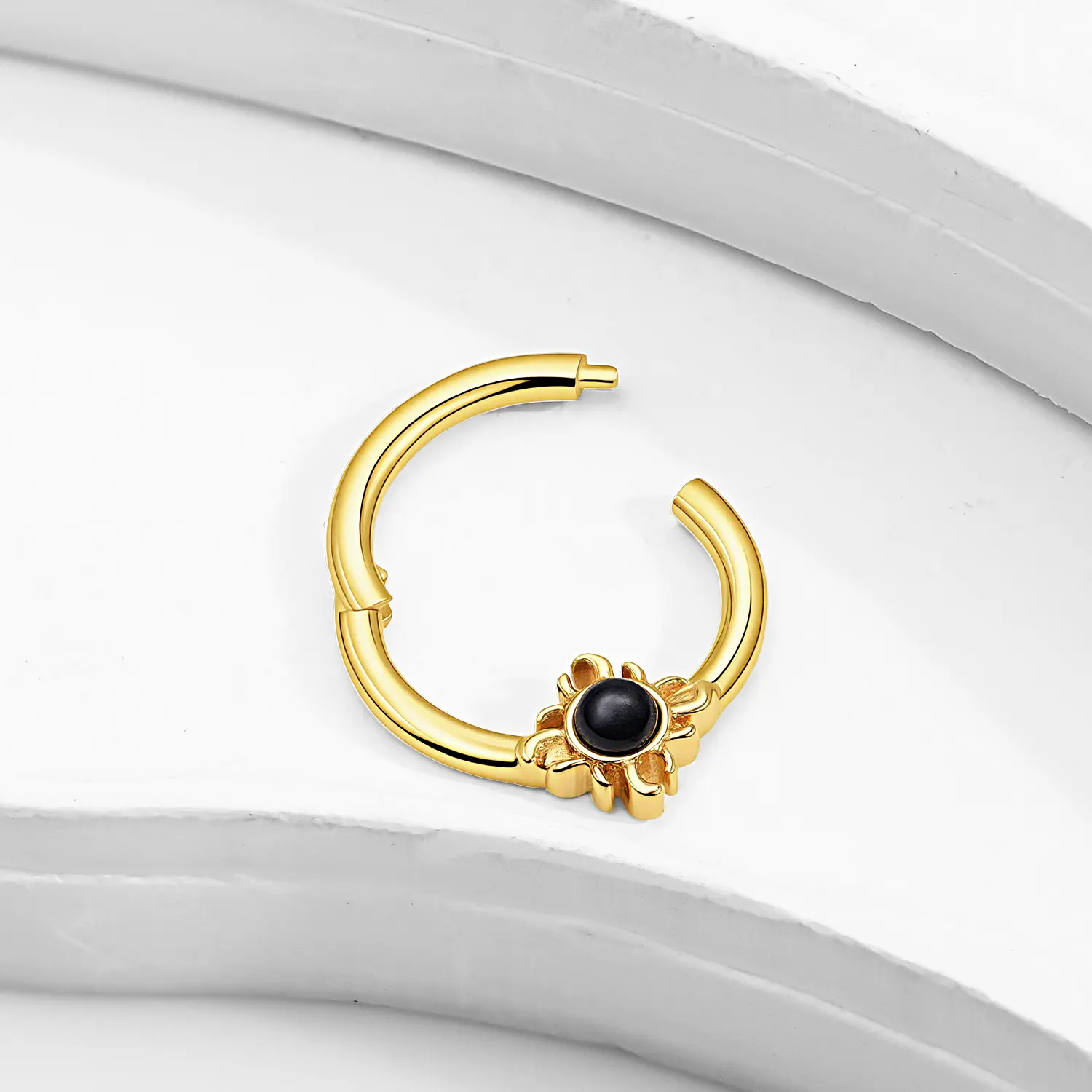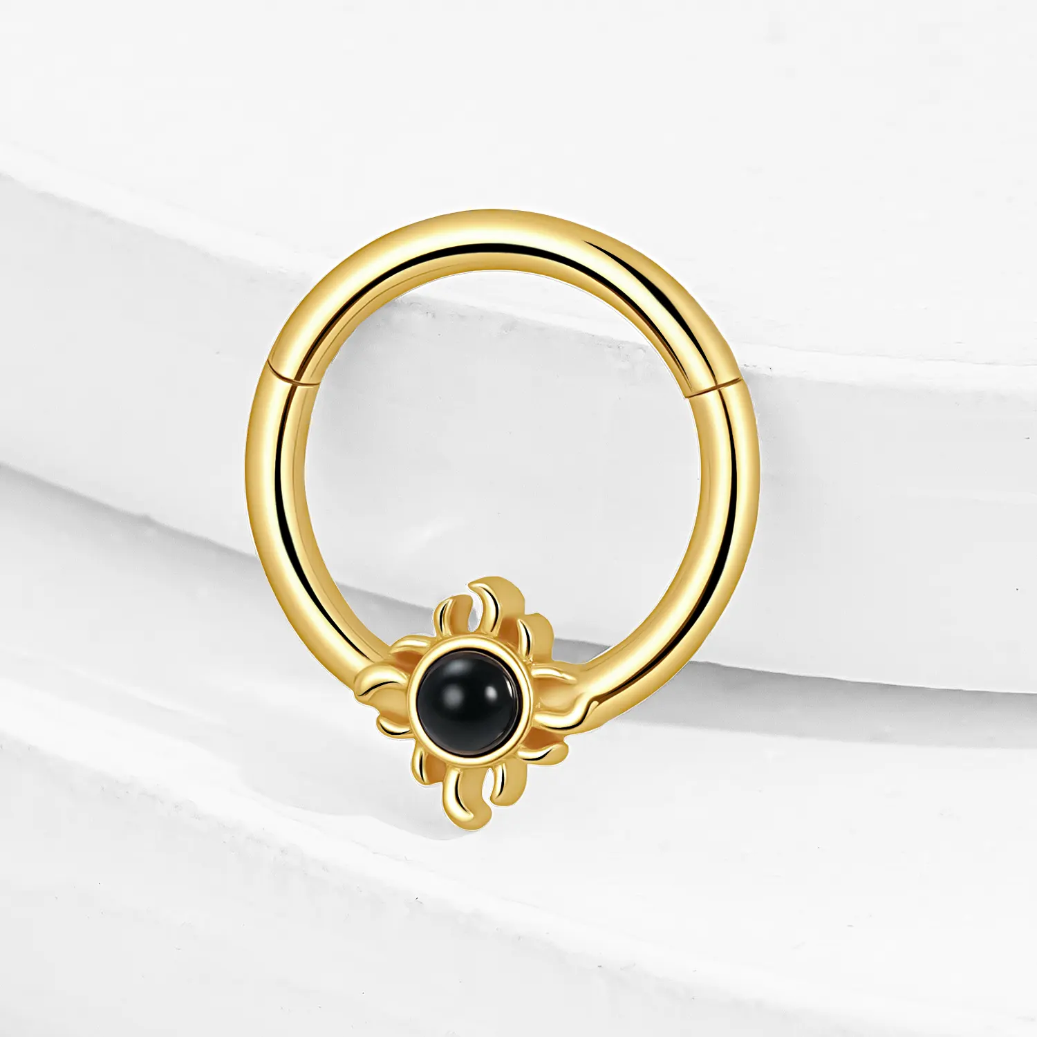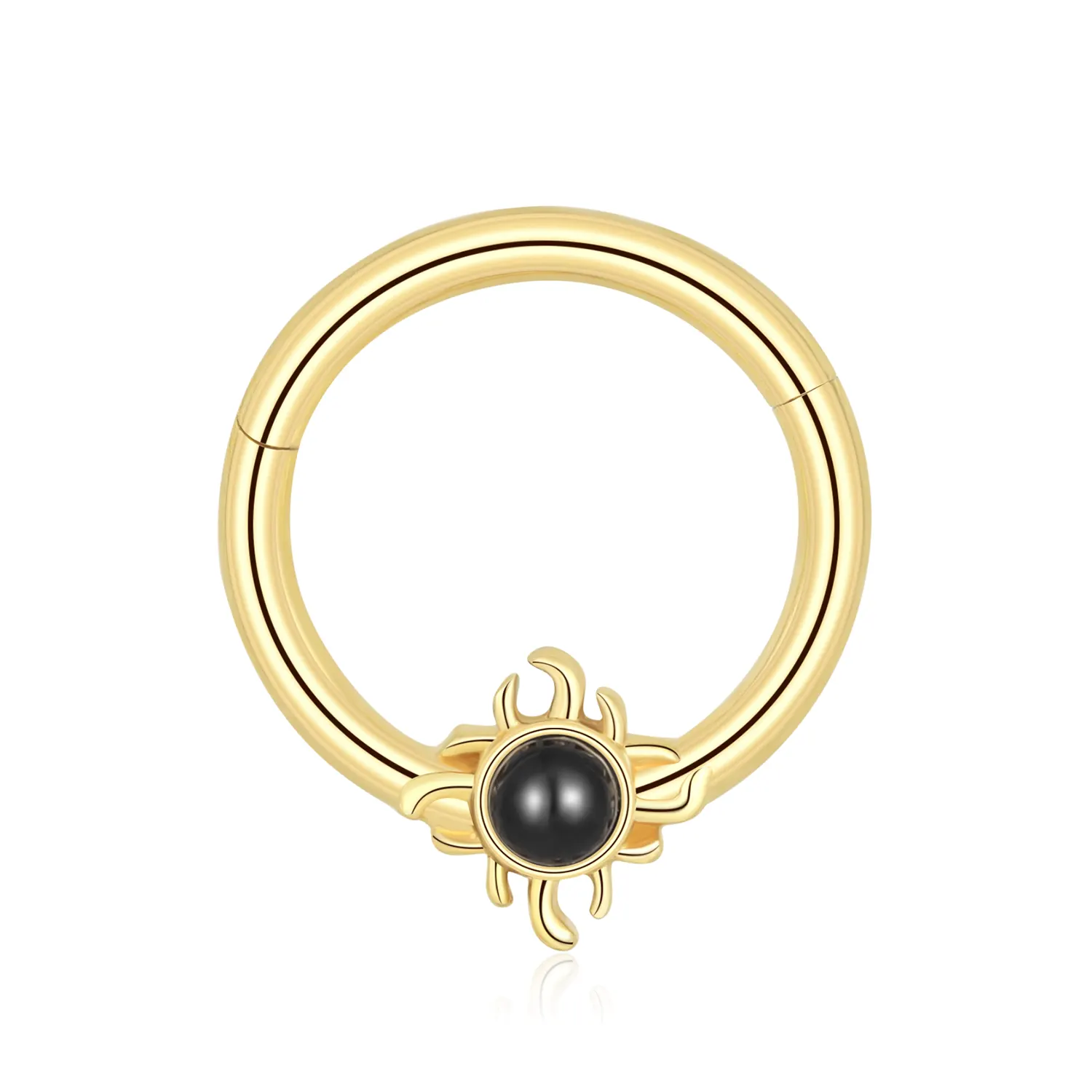 Introducing GZ40702G-BK1608: A 14K solid gold threadless labret stud featuring a radiant sunburst design with a black CZ stone center. Symbolic, stylish, and ready to elevate your body piercing jewelry game.