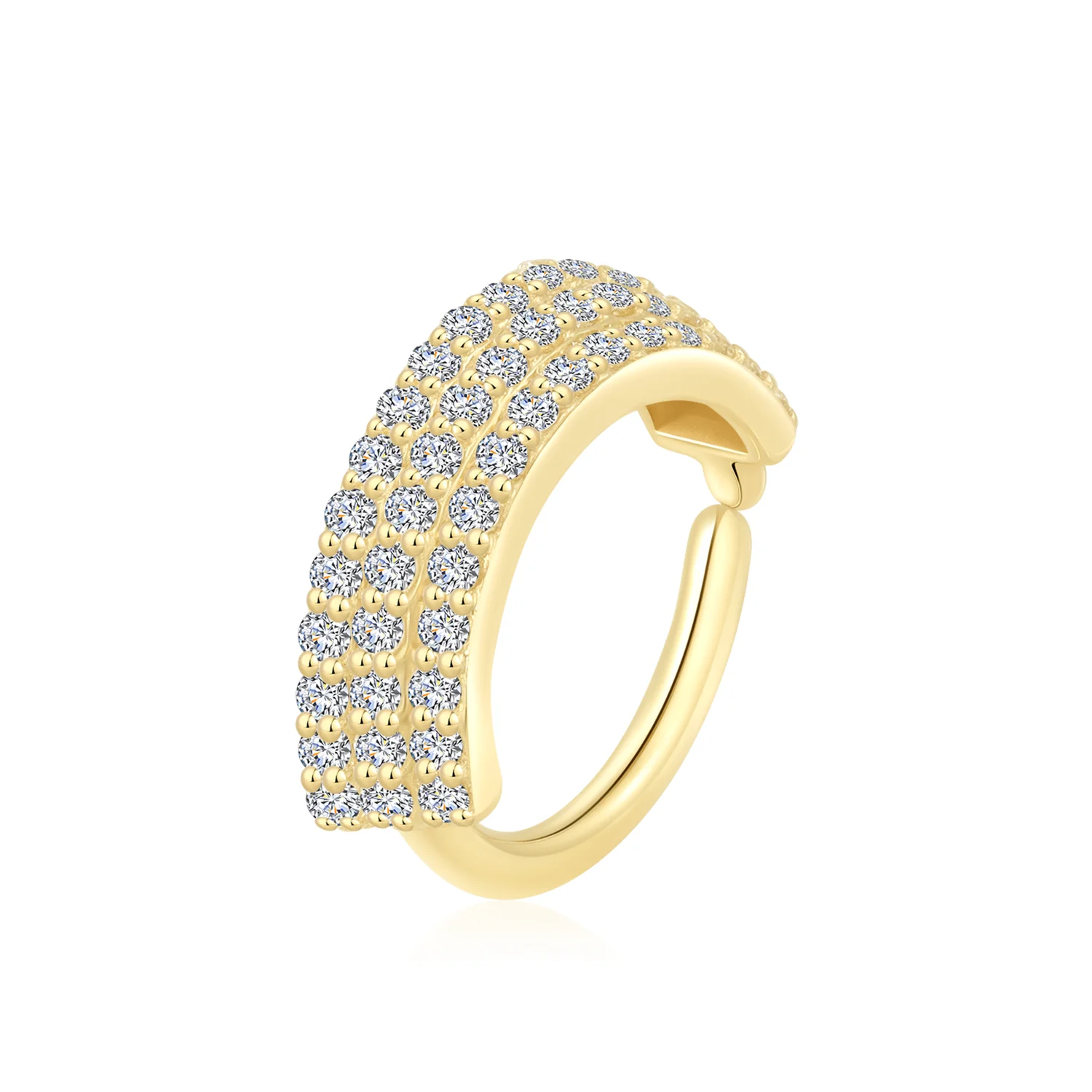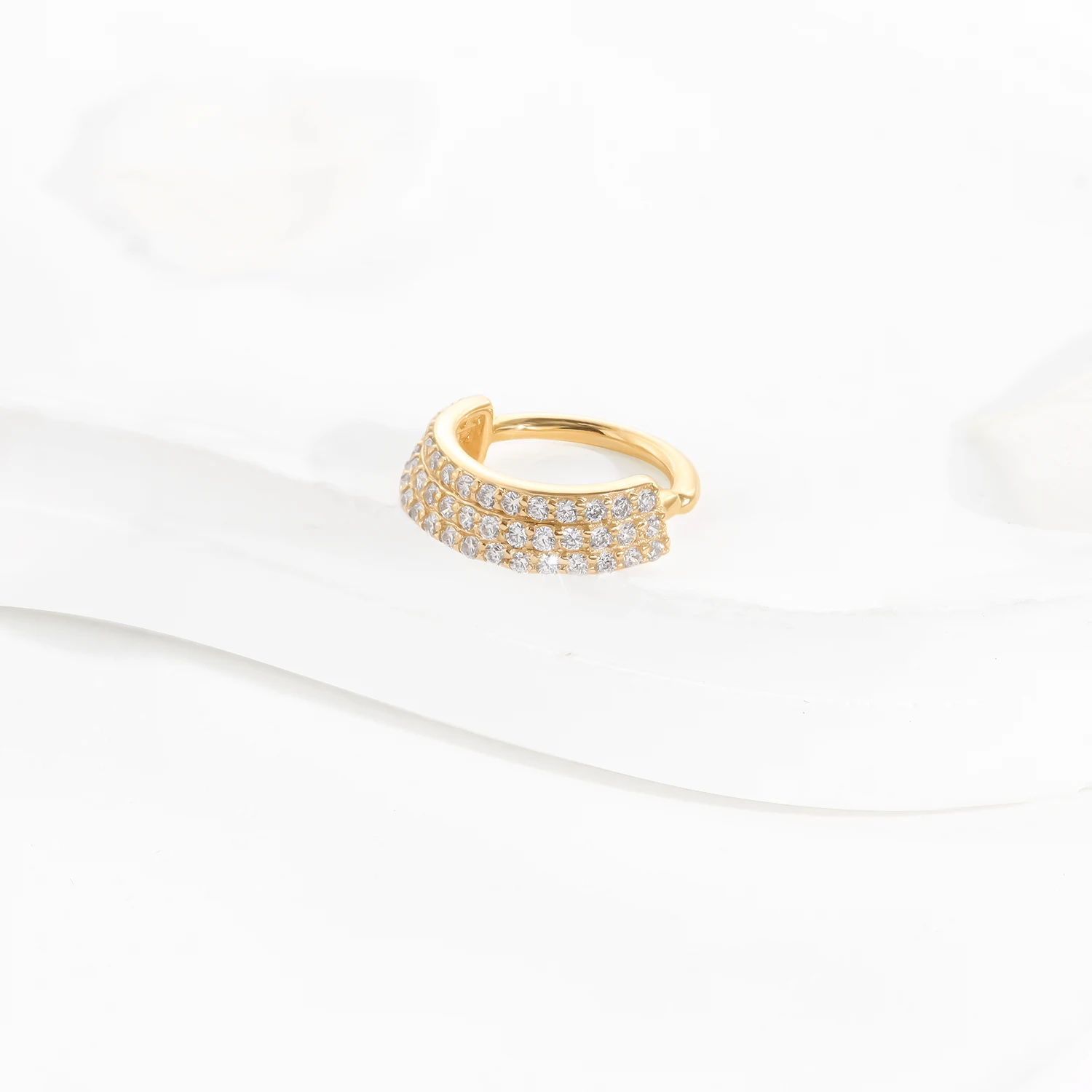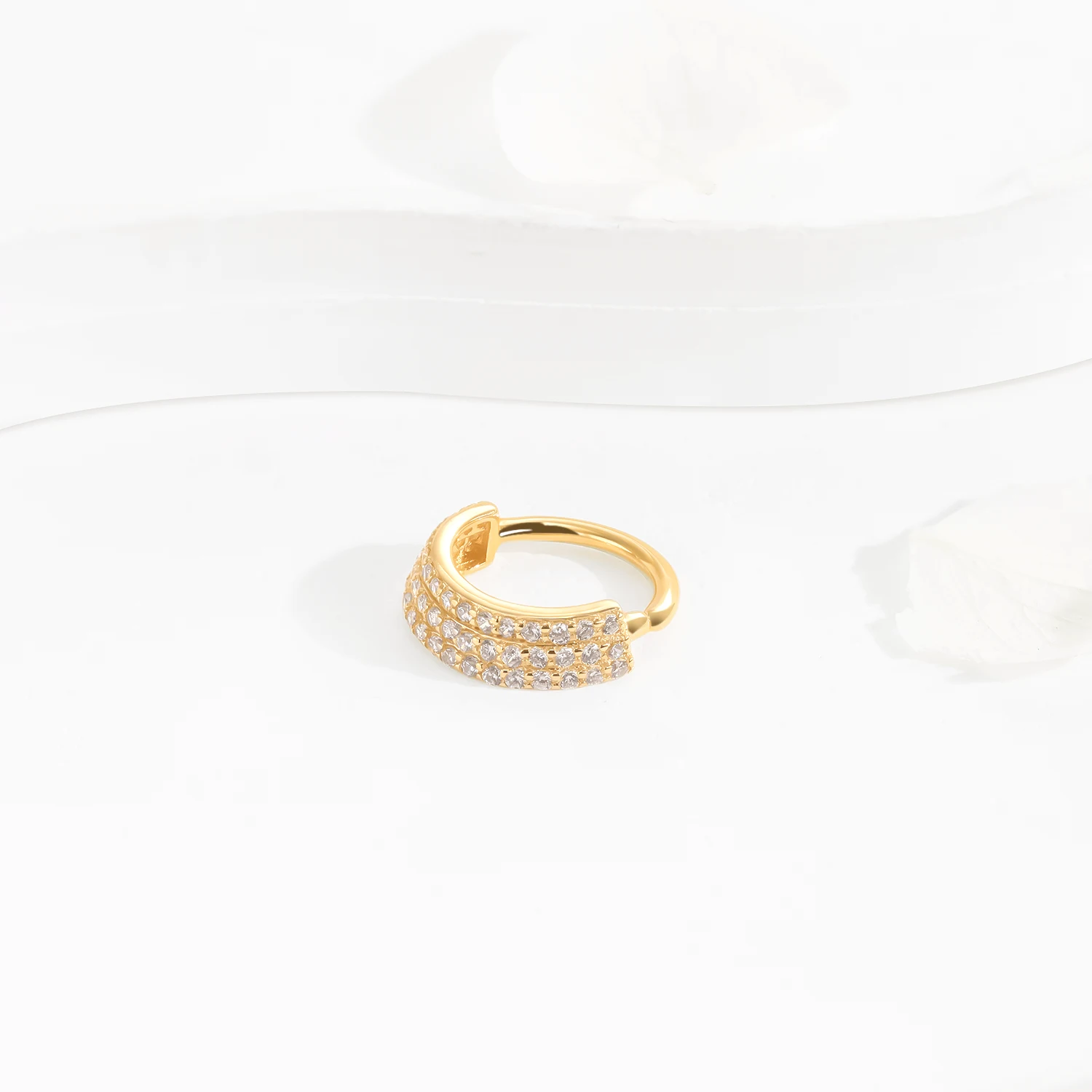 Discover the GY31G, a 14K solid gold seamless piercing jewelry ring adorned with three rows of sparkling 5A cubic zirconia stones. This piece combines ultimate luxury with striking beauty, ideal for enhancing any body piercing with a touch of glamour. 1.2*8mm