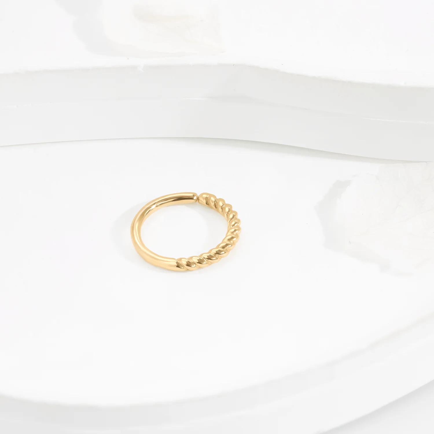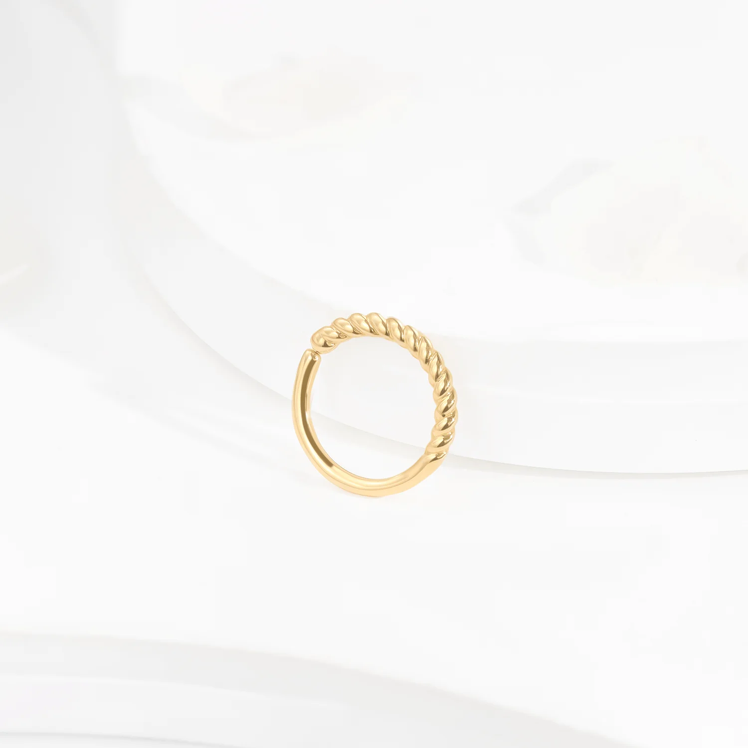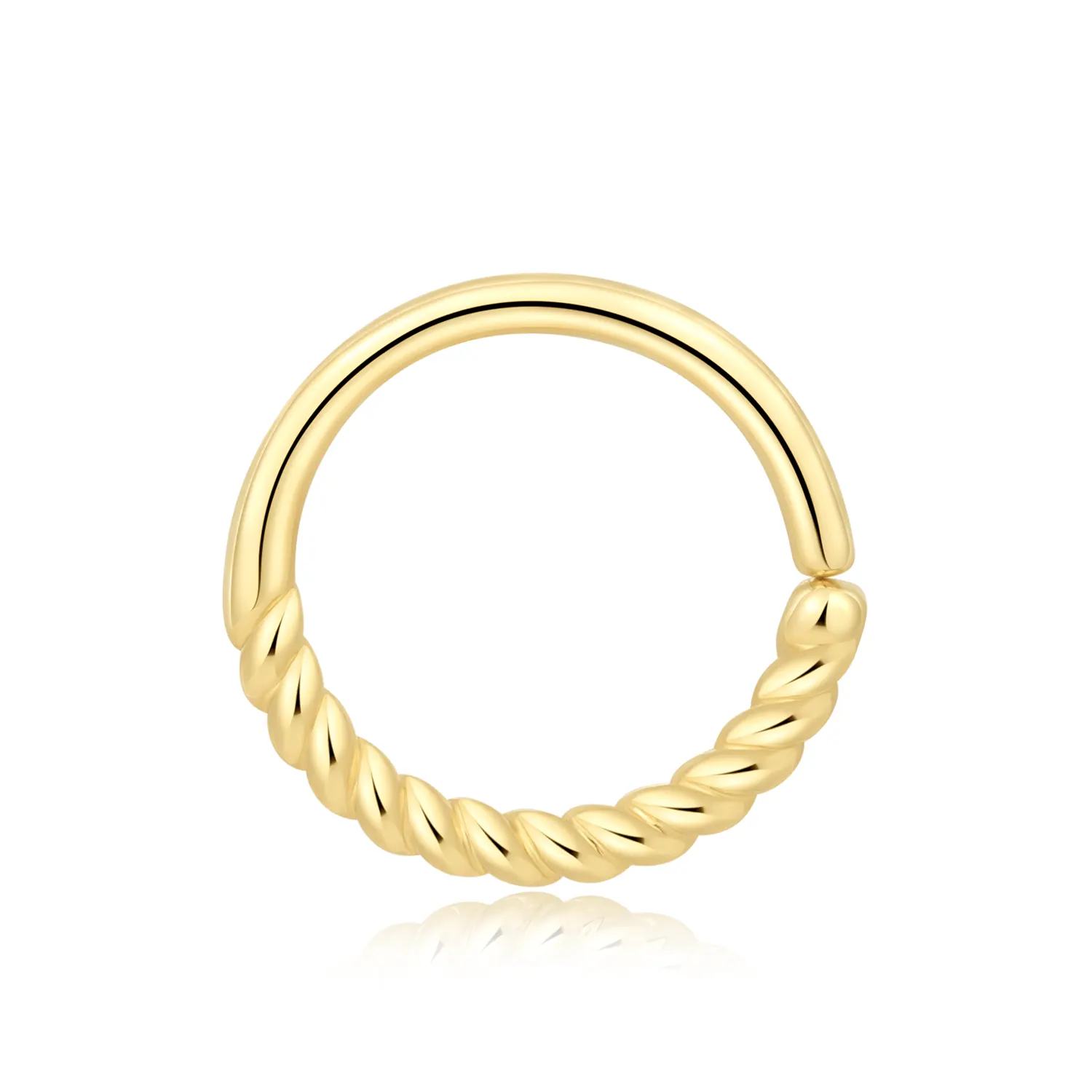 Introducing GY35G, a 14K solid gold seamless ring with a delicate twisted design, adding a touch of sophistication to your body jewelry collection. This minimalist yet eye-catching ring is perfect for various piercings, offering a smooth, seamless fit. The secure push mechanism ensures easy wear while maintaining a sleek and polished look, making it ideal for everyday elegance.